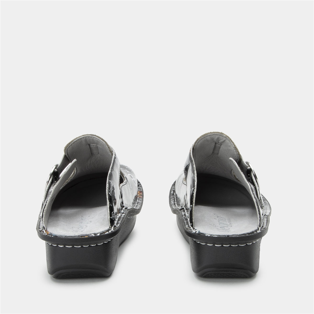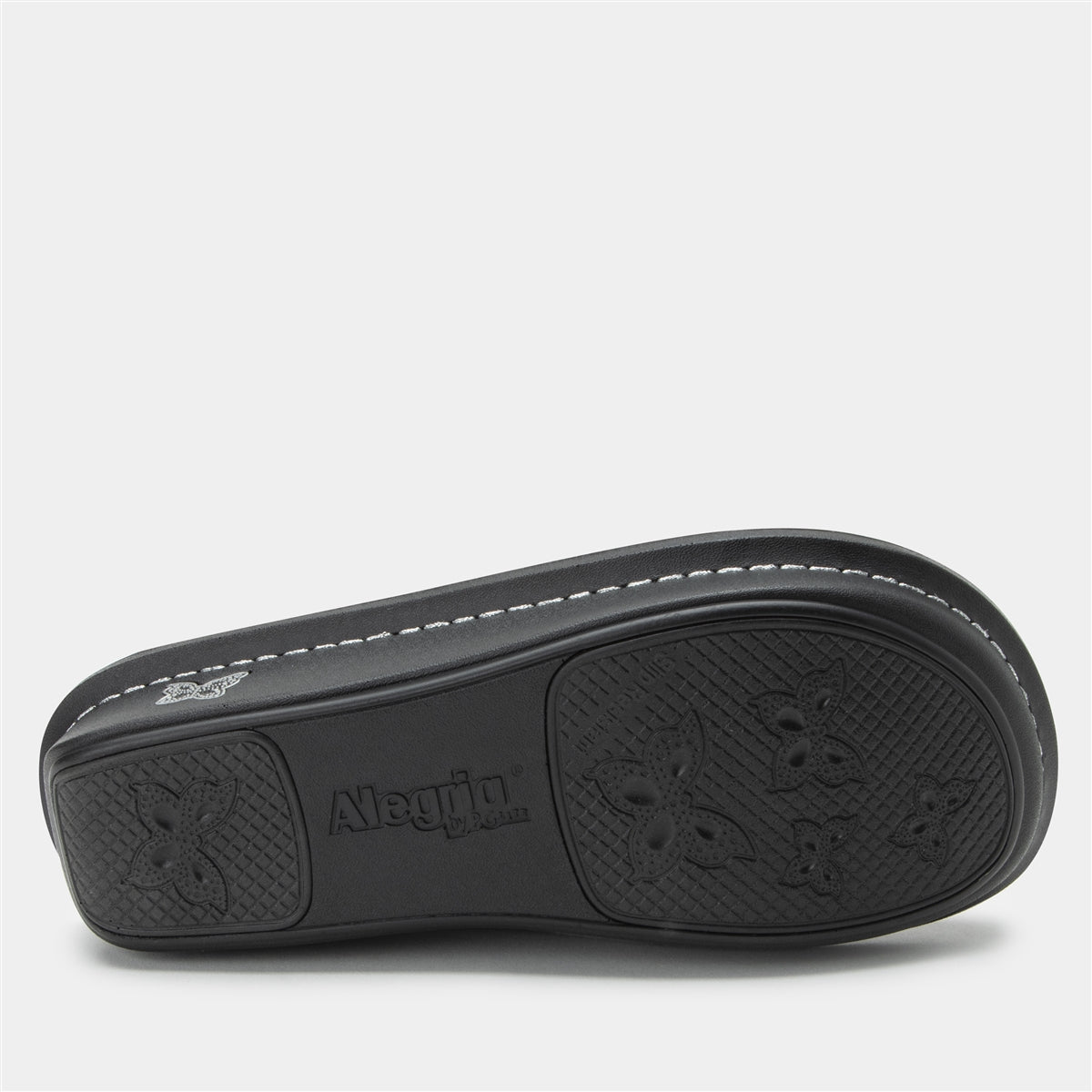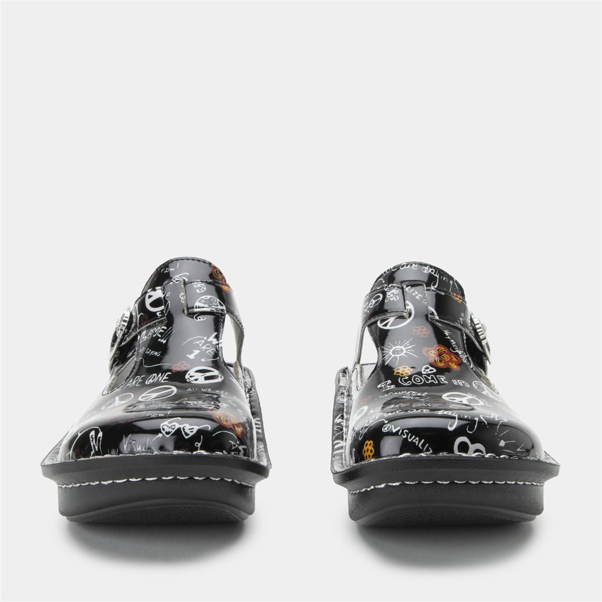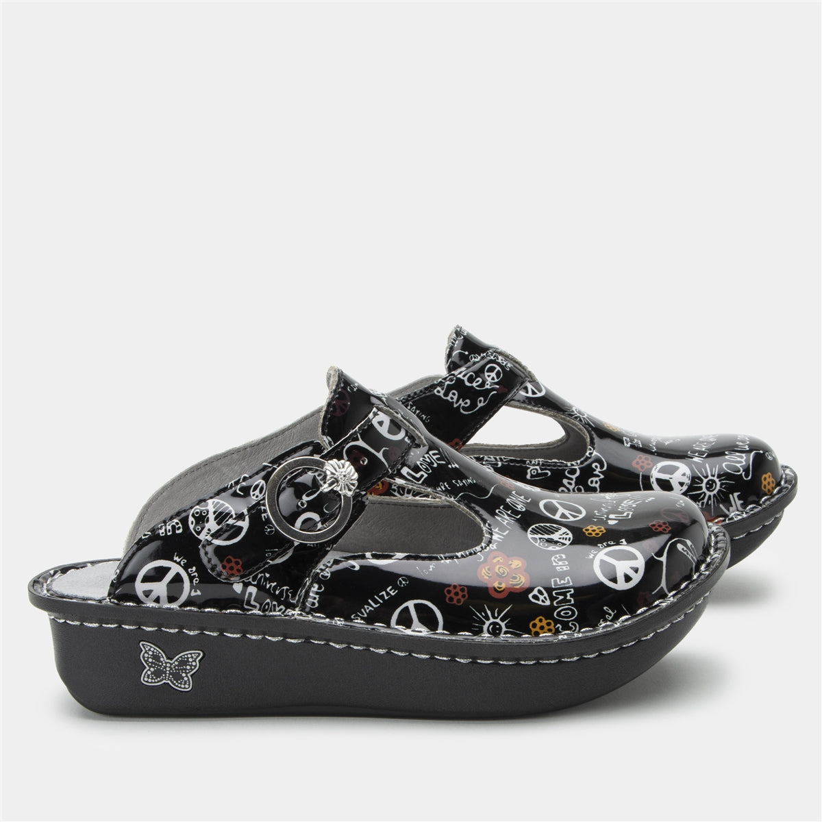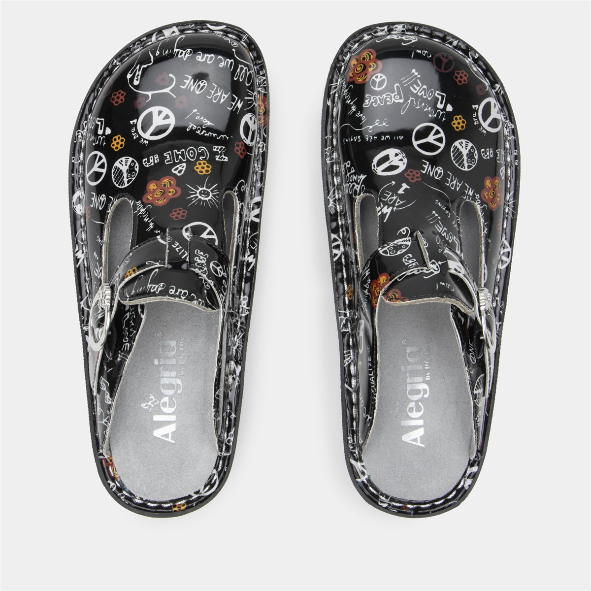 The Alegria Classic Peace & Love clog, featuring a print adorned with peace signs and "Peace and Love" on sleek black leather. This Classic clog seamlessly combines comfort and a touch of nostalgia-inspired style. Embrace a sense of peace and love with each step in these uniquely designed clogs.