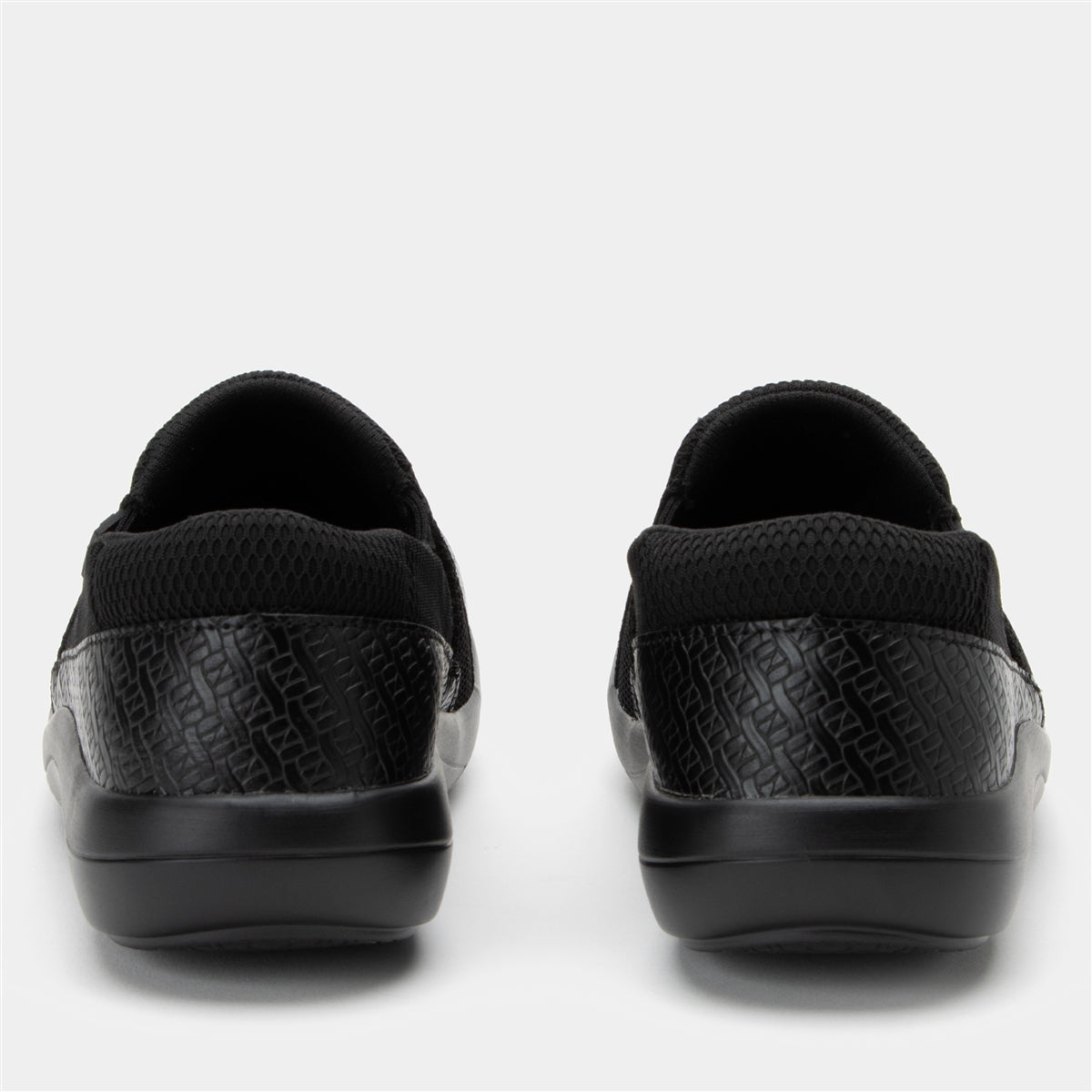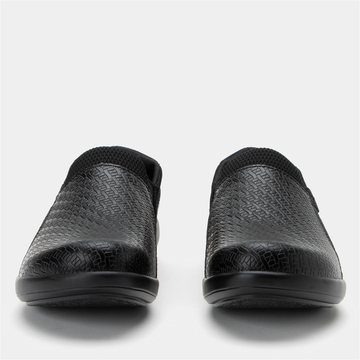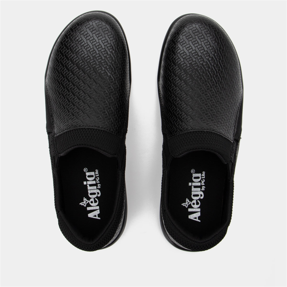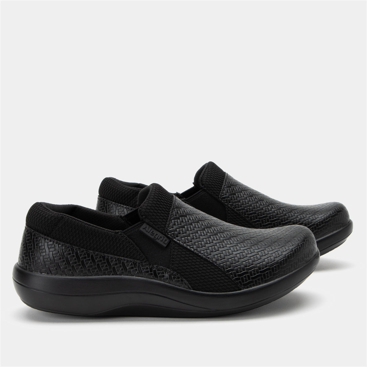The Alegria Duette comfort nursing shoes with a beautiful black-on-black woven design features man-made materials with lots of charm and comfort. On the comfort side, you'll find a padded collar for ankle support, a double elastic gore that provides easy on-and-off wear, and a dual-density polyurethane slip-resistant outsole to keep you steady on your feet in all kinds of weather.Features you'll find in every Duette include: