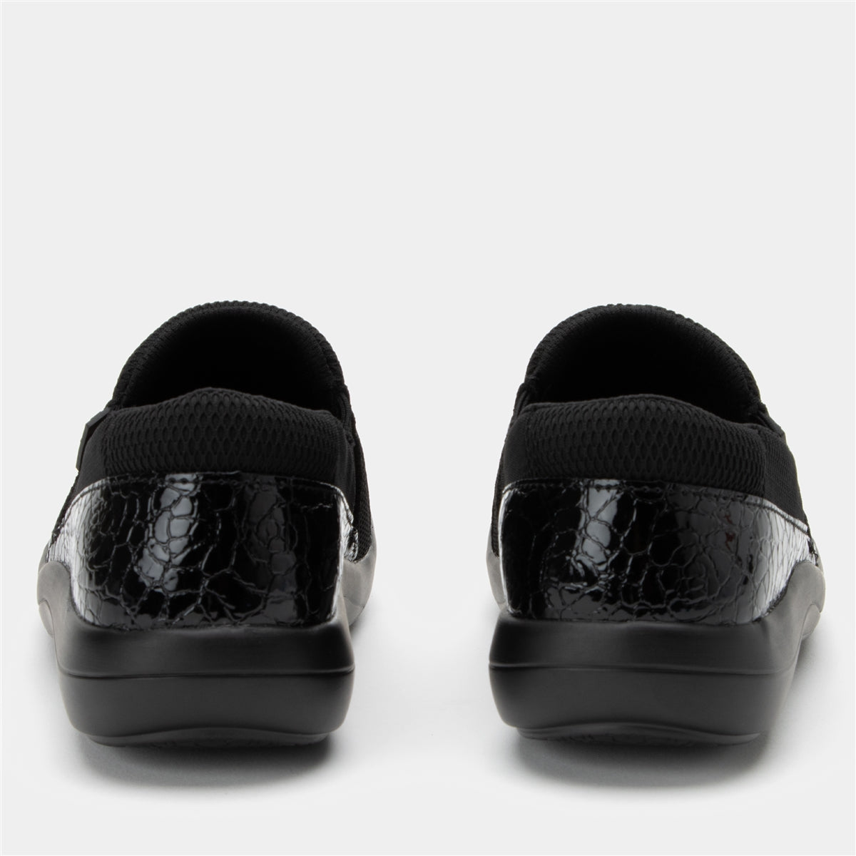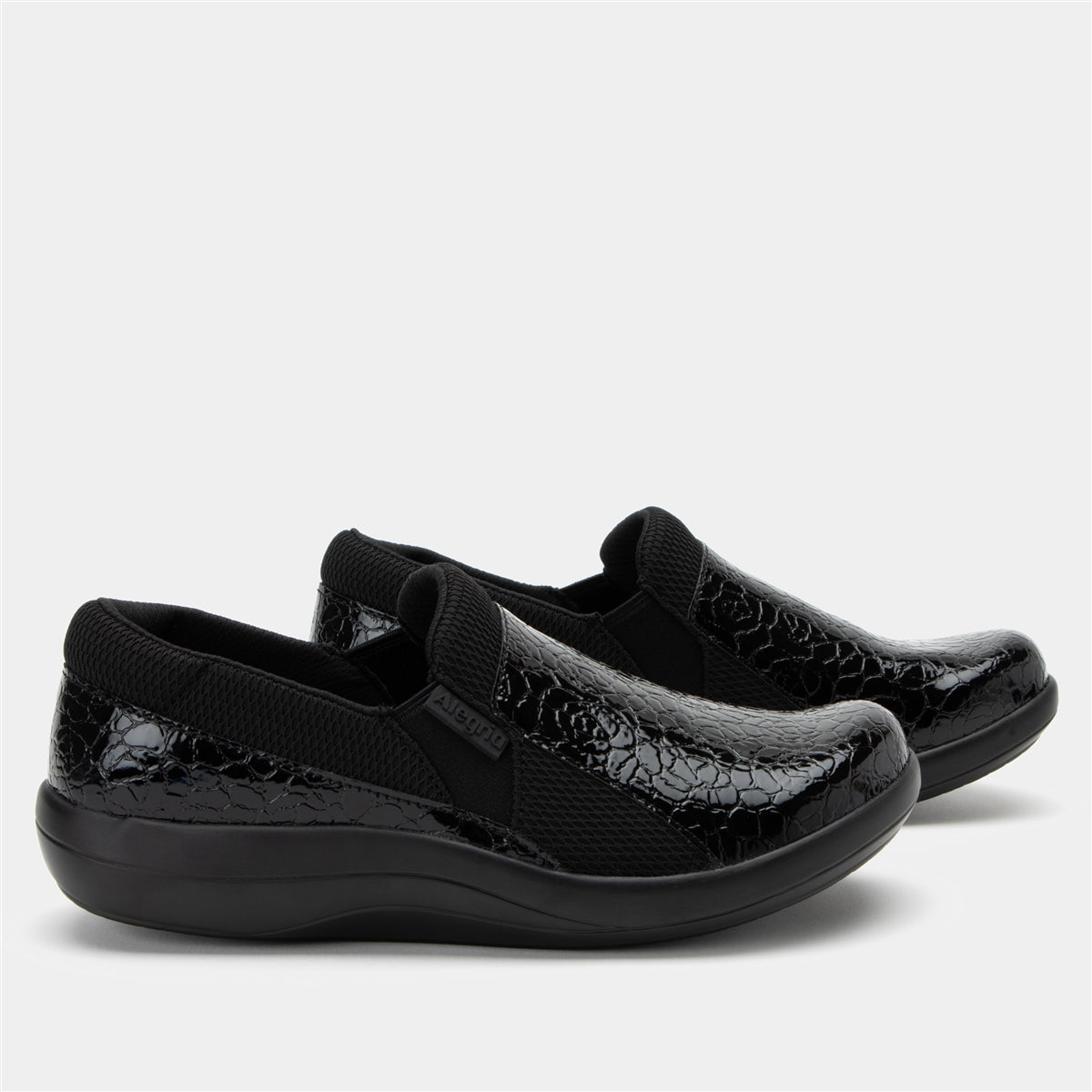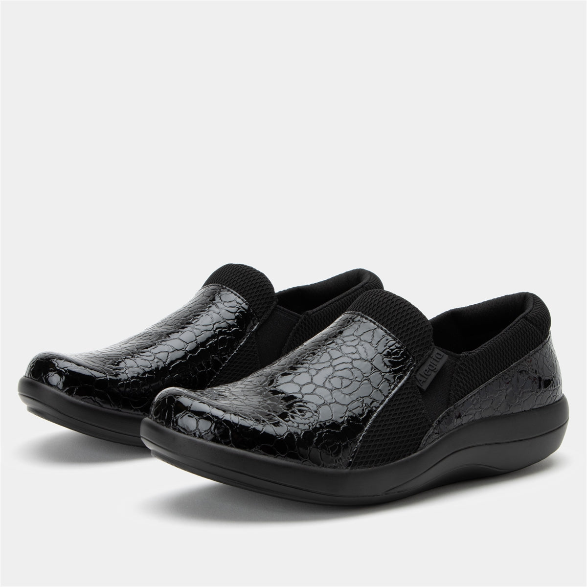 Who needs a plain black nursing shoe when you can sport your style with Alegria's Duette comfort shoe in Flourish Black? A man-made upper with a textured black-on-black rose pattern covers this comfy loafer and will make you stand out among the rest of the people on your floor. A padded collar gives you extra ankle support and double elastic gores at the side make for easy on-and-off wear when you need to be on the go. The Duette also features a dual-density polyurethane slip-resistant outsole that provides enhanced shock absorption and outstanding rebound for every step. It also includes the signature removable and replaceable Alegria footbed made of cork, polyurethane and memory foam for a custom fit. Try the Duette in Flourish Black with jeans or scrubs for a great look today!Features you will find in every Duette include: