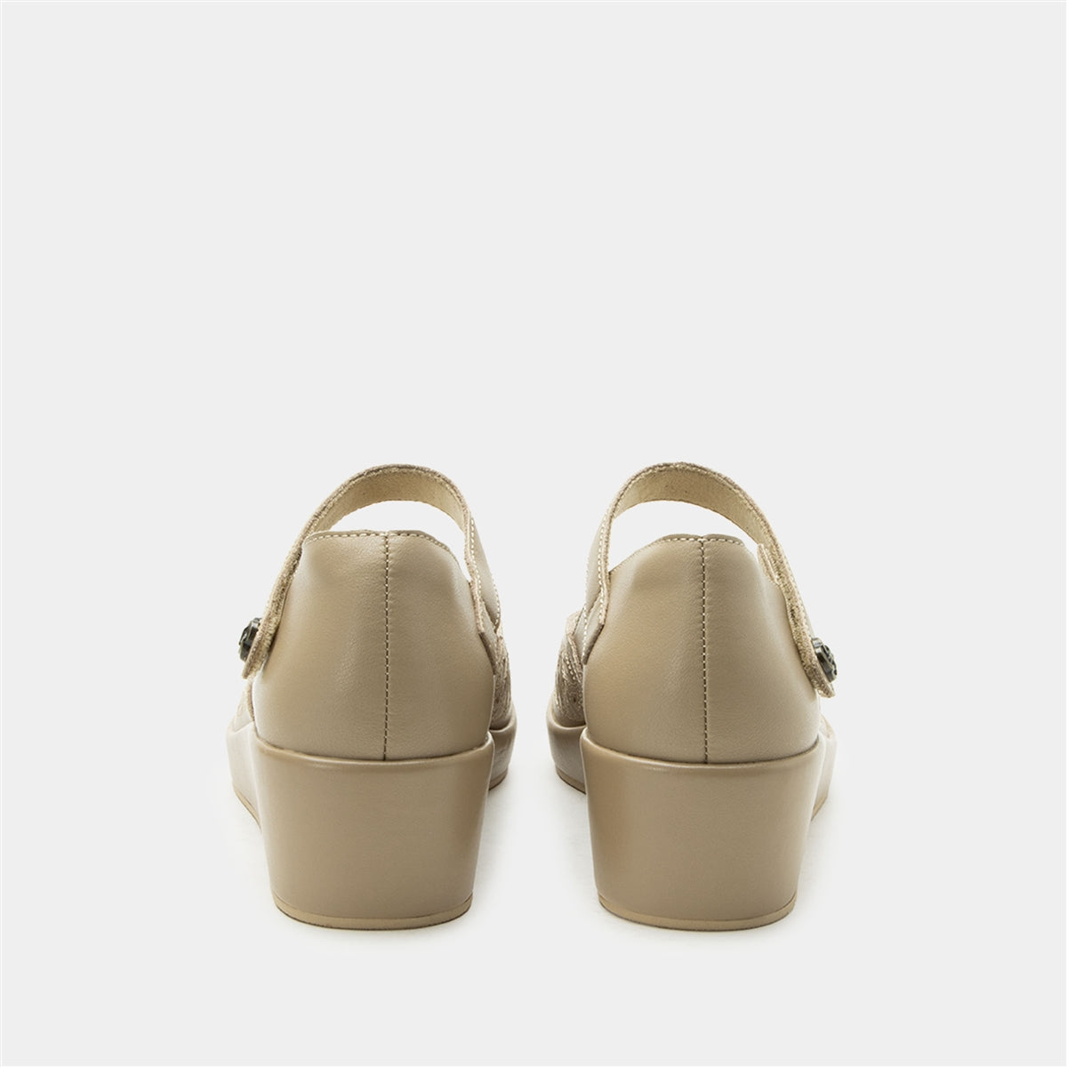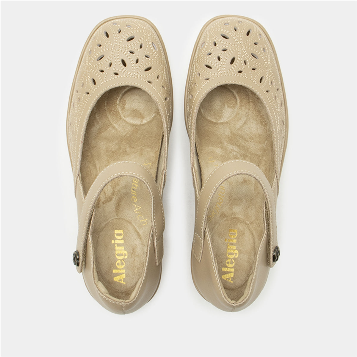 Step into timeless sophistication and comfort with the Alegria Hayes in Beige Breeze. Featuring premium leather uppers adorned with intricate laser-cut holes, this elegant style provides both a unique texture and enhanced breathability. The adjustable strap with a decorative button closure ensures a secure and custom fit, while the innovative Tri-Form wedge outsole delivers unparalleled support, stability, and shock absorption. With its removable dual-density Signature Arch footbed, this shoe promotes foot health, making it an excellent choice for work, casual outings, or any occasion.Additional Benefits:
