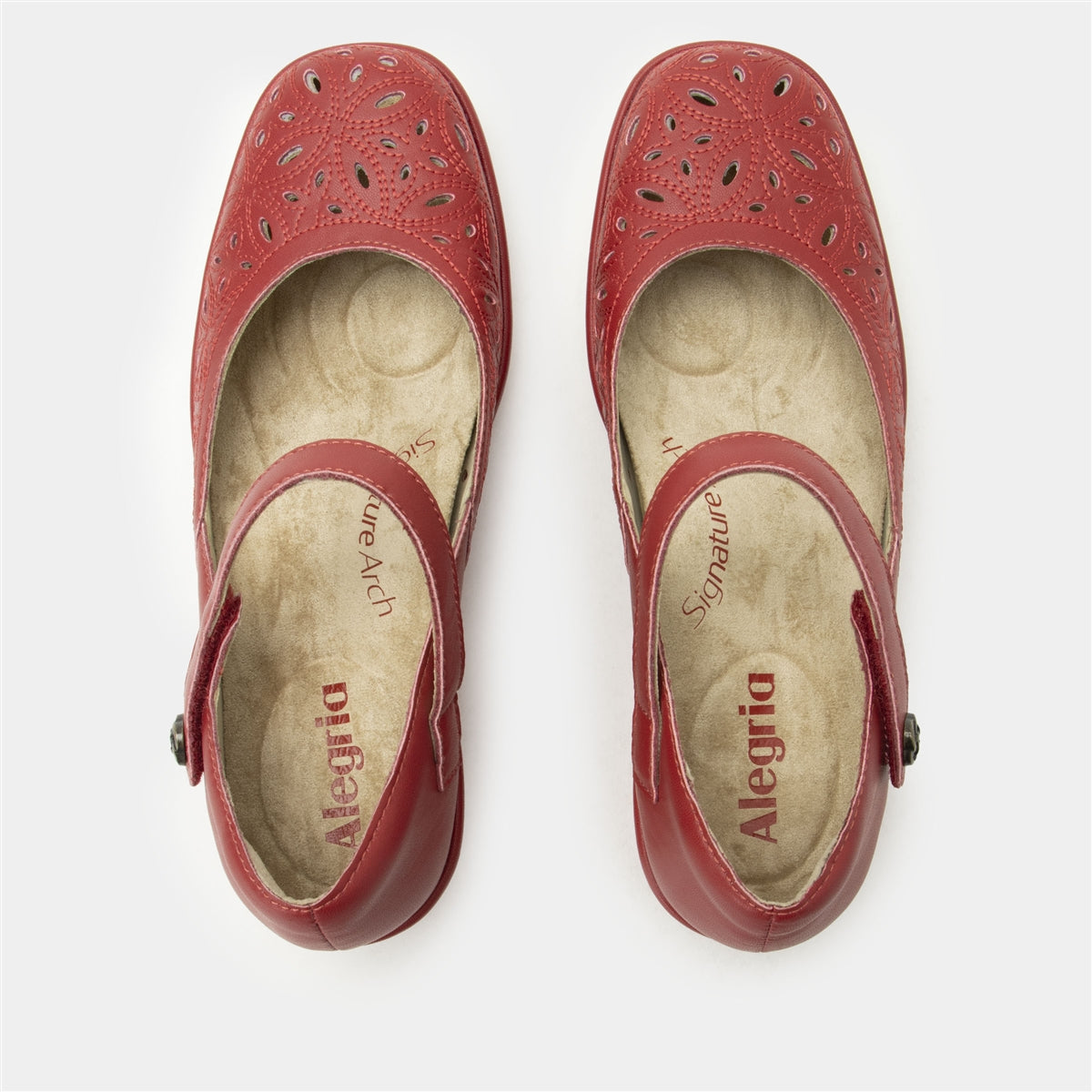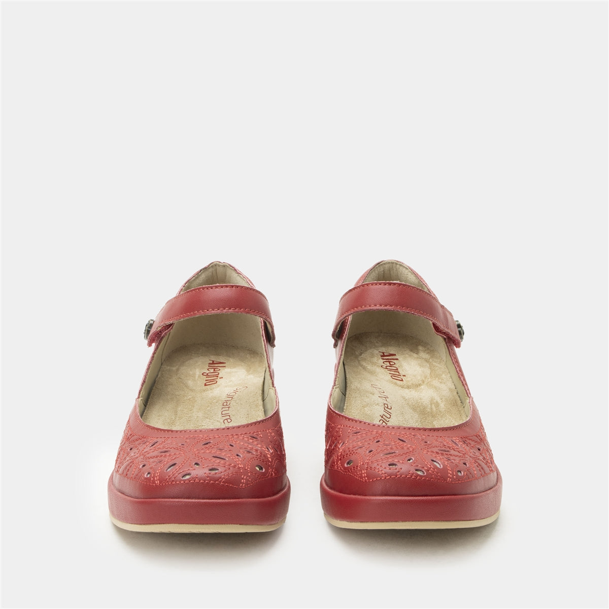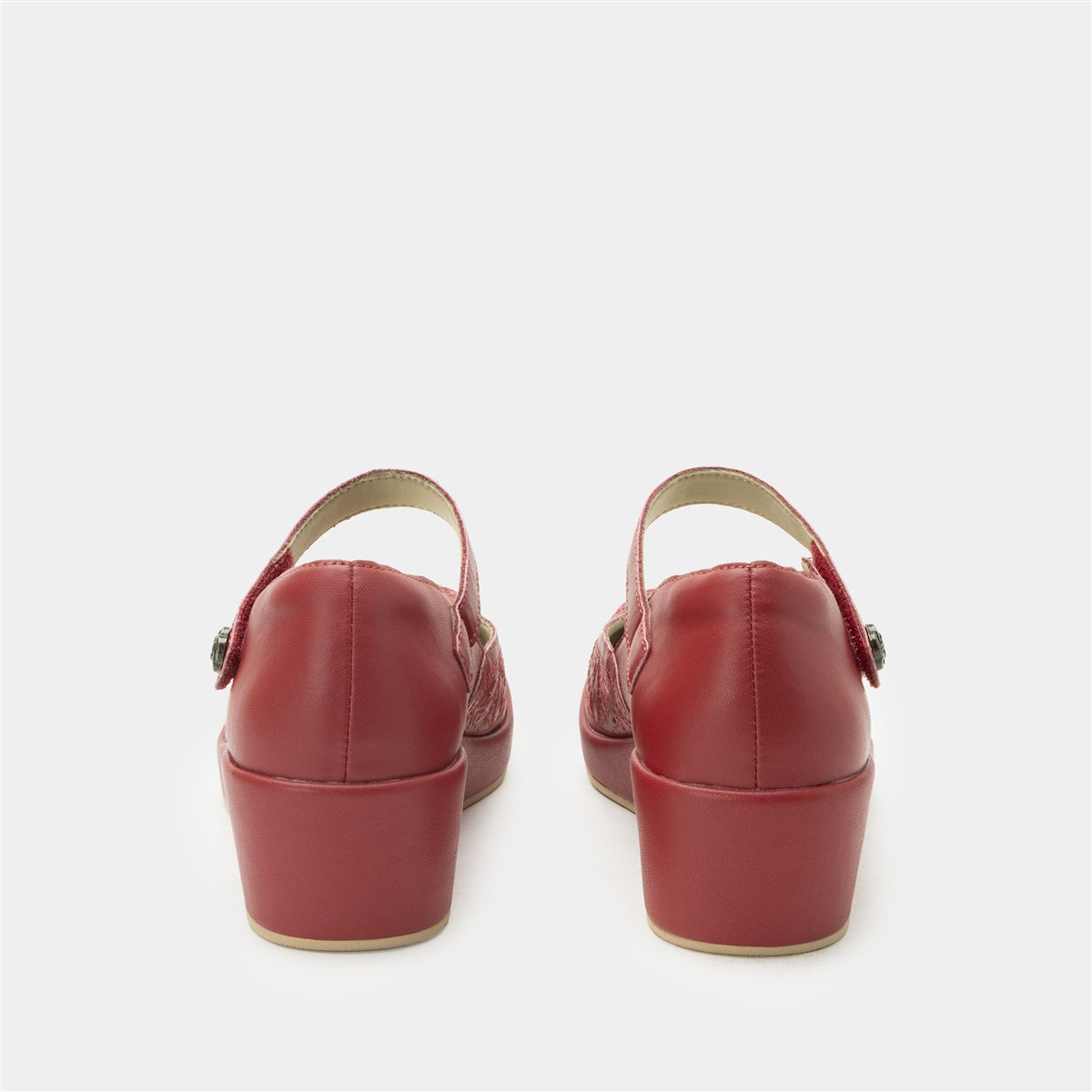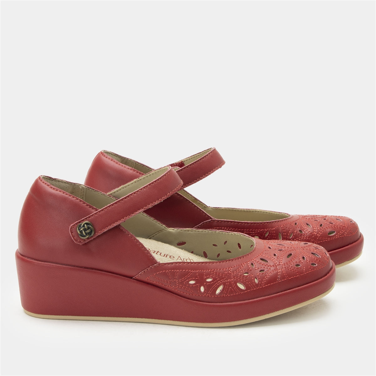 Make a bold statement with the Alegria Hayes in Ruby Breeze. Featuring premium leather uppers with intricate laser-cut detailing, this vibrant design adds texture, breathability, and a pop of color to your wardrobe. The adjustable strap with a decorative button closure ensures a secure and comfortable fit, while the advanced Tri-Form wedge outsole delivers superior support, stability, and shock absorption. The removable dual-density Signature Arch footbed promotes foot health, making this stylish wedge perfect for work, casual outings, or evening events.Additional Benefits: