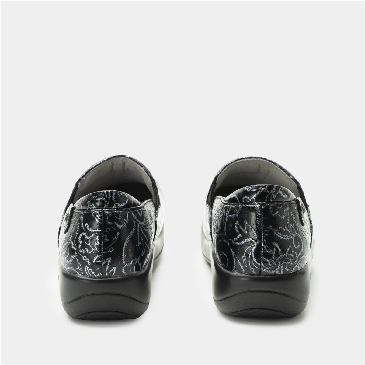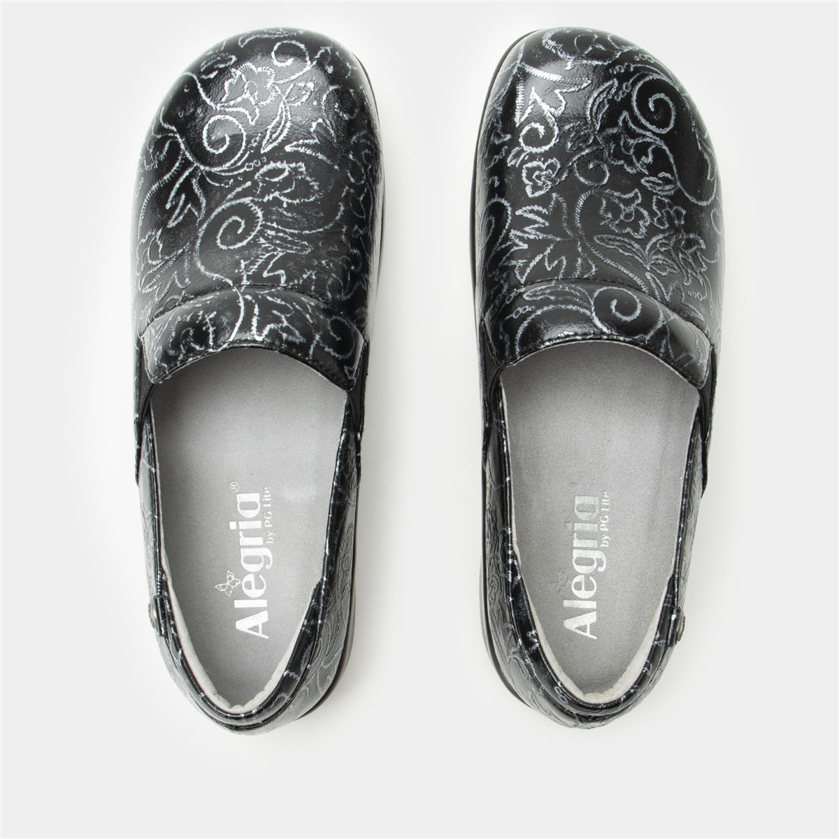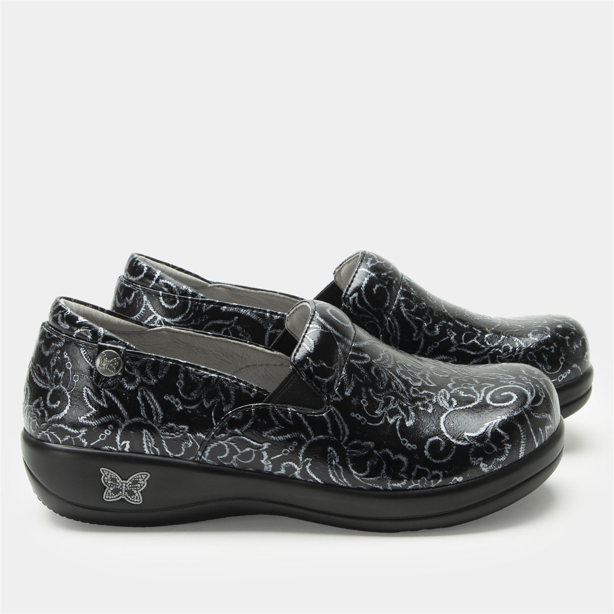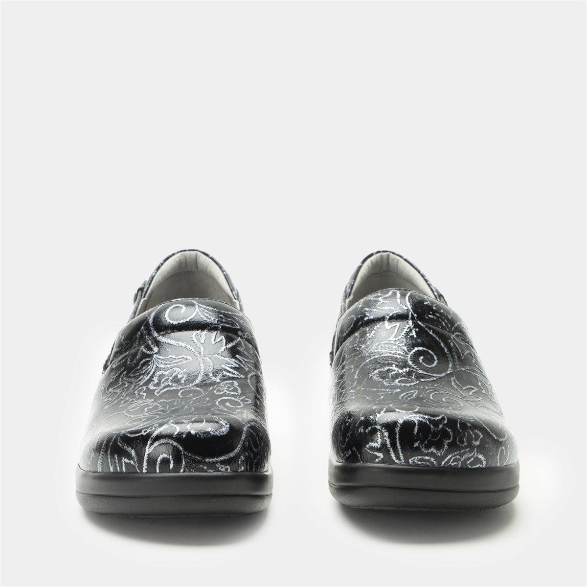 The Alegria Keli Embroider Me Pewter is the perfect choice for professionals like nurses, teachers, and retail workers who spend long hours on their feet. Designed for comfort and practicality, it features double elastic gores for easy slip-on wear and a padded collar for enhanced ankle support. The stain-resistant leather uppers showcase a beautiful embroidered pewter finish, while the slip-resistant outsole offers safety and stability. The signature removable and replaceable footbed from Alegria ensures lasting arch support, making this shoe both stylish and functional. A 1 1/4-inch heel height adds just the right amount of lift for everyday comfort.Features you will find in all Alegria Keli shoes:
