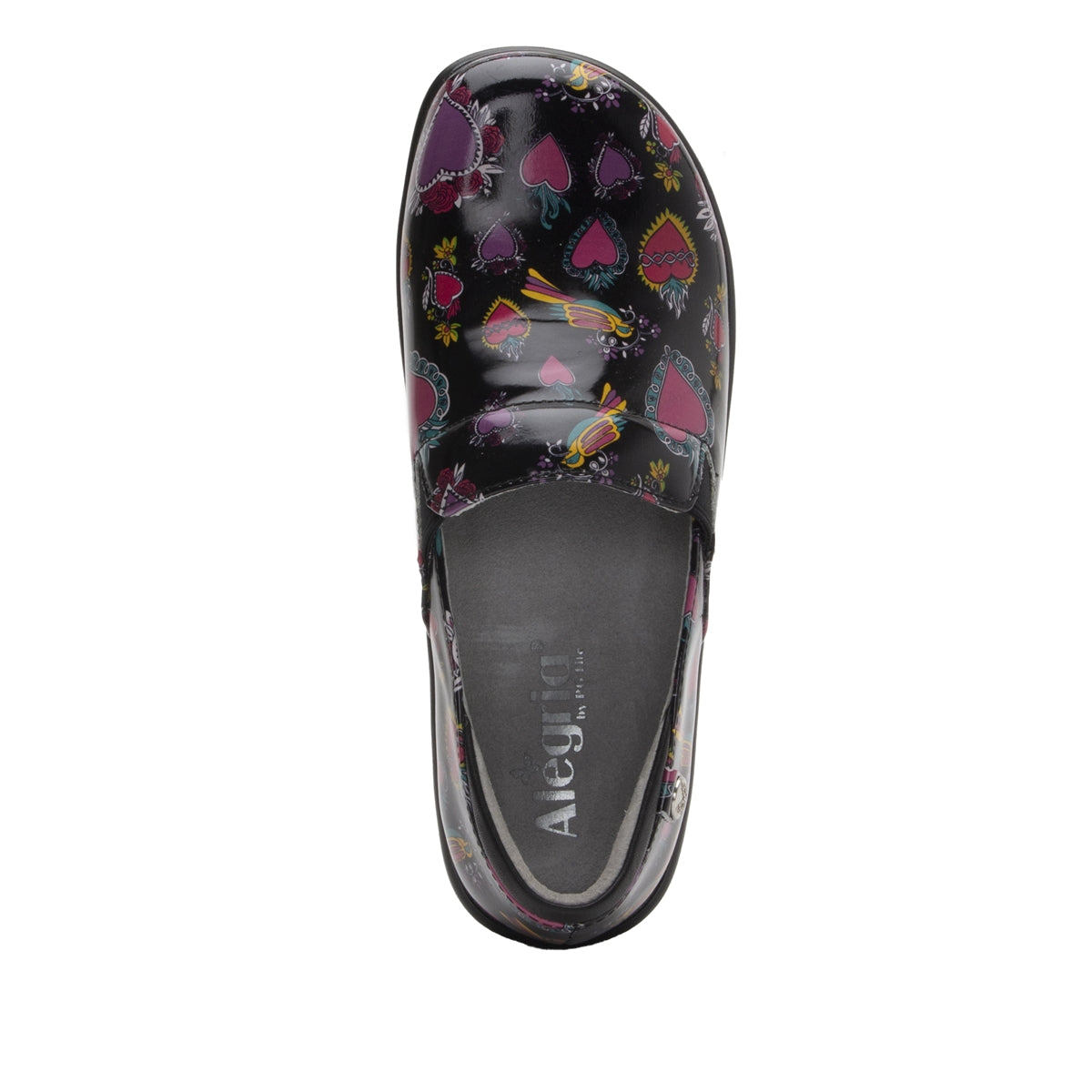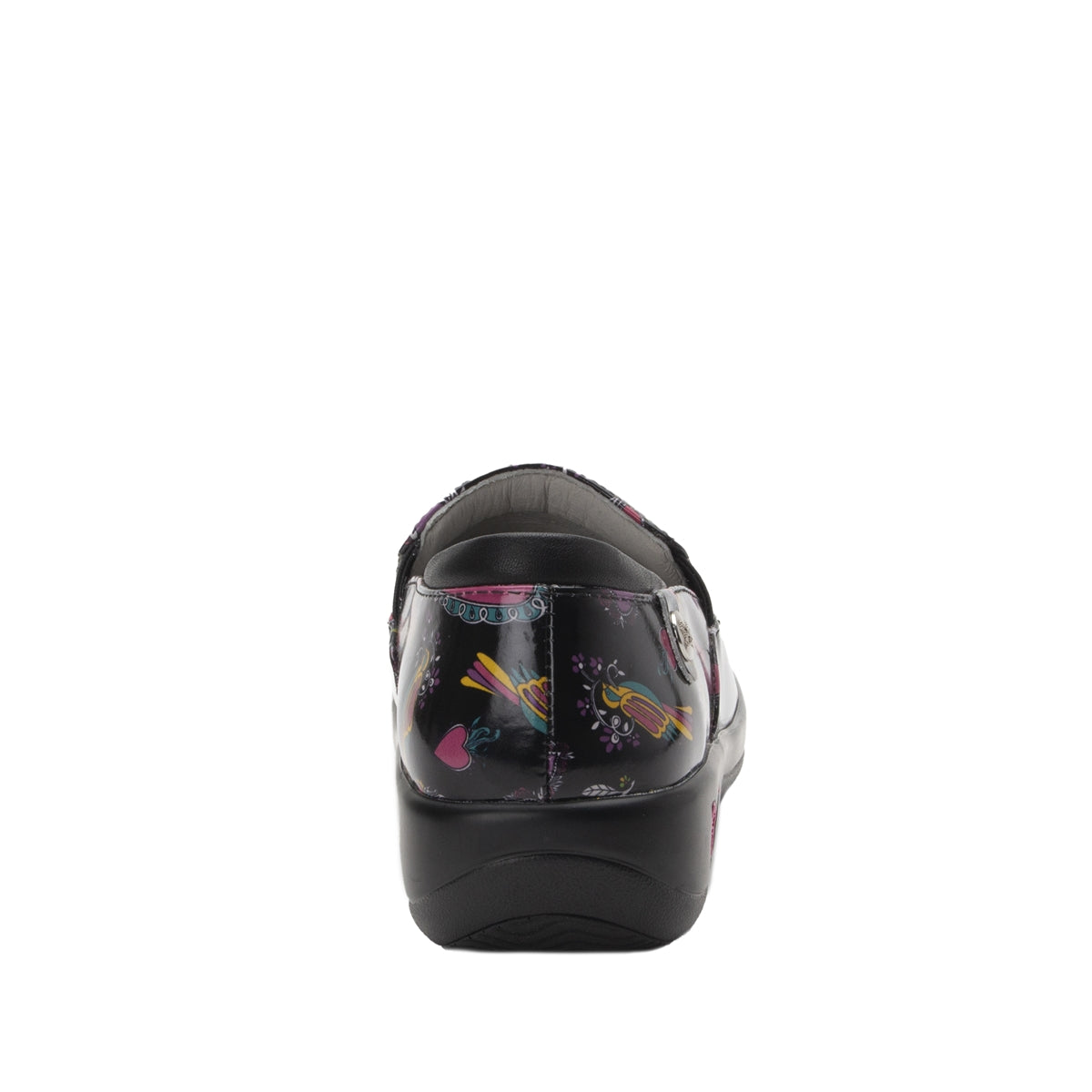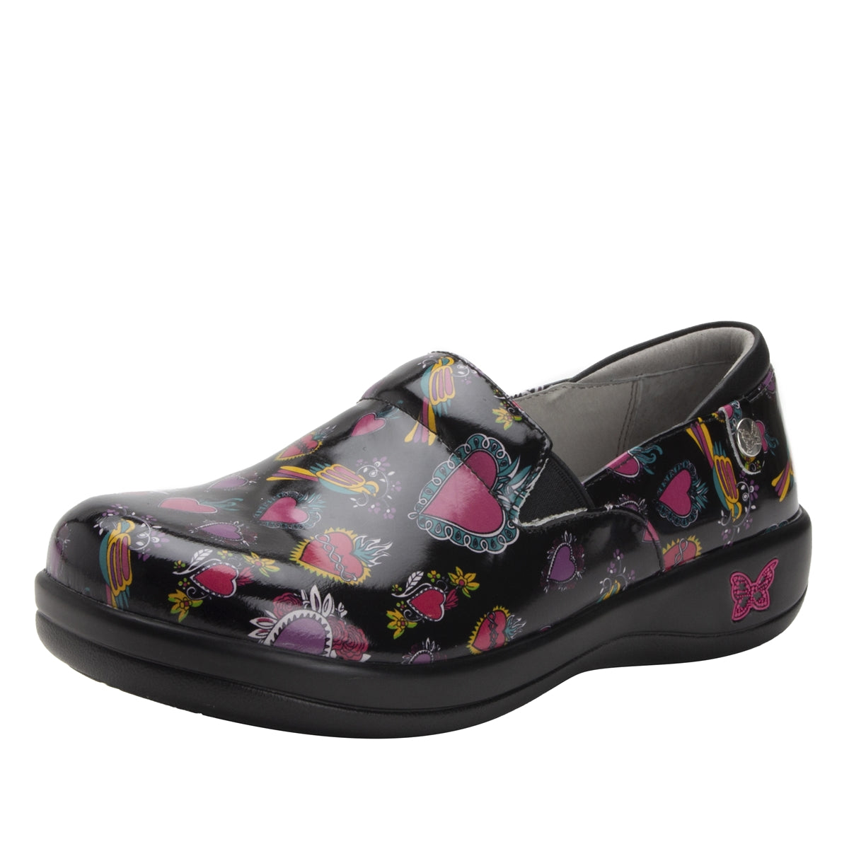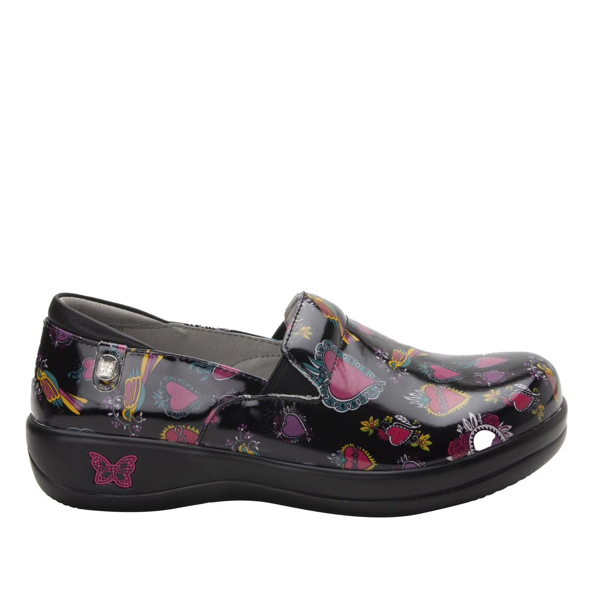 Enjoy the fun hand-drawn design leather upper of the Keli shoe in Frida by Alegria. These bold bursts of color will brighten day. The Keli is made for comfortable support with double elastic gores at the sides, a padded collar at the back and a conforming removable and replaceable Alegria footbed constructed of cork, polyurethane and memory foam for a perfect fit every time. Slip-resistant outsoles give you excellent arch support for long shifts, too. Pair this professional loafer with scrubs, jeans or business casual clothes for a beautifully cool look.