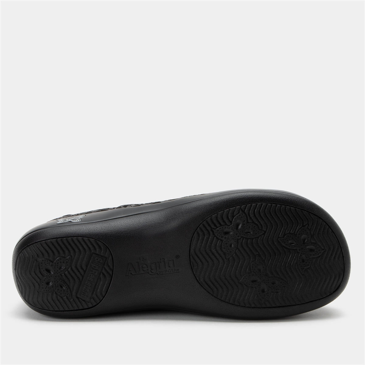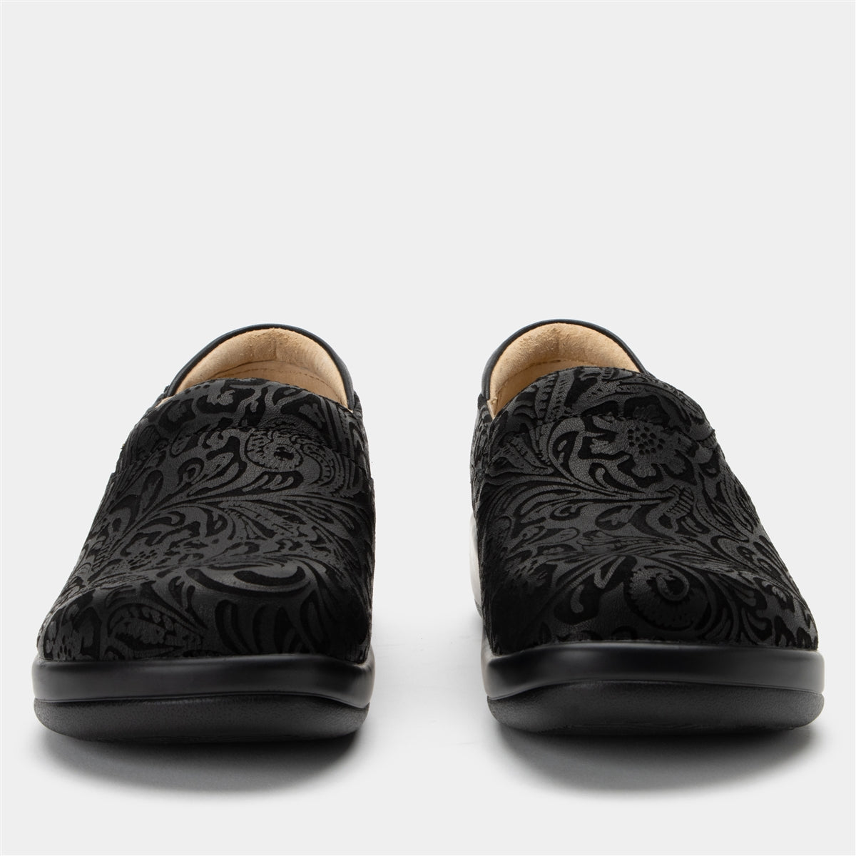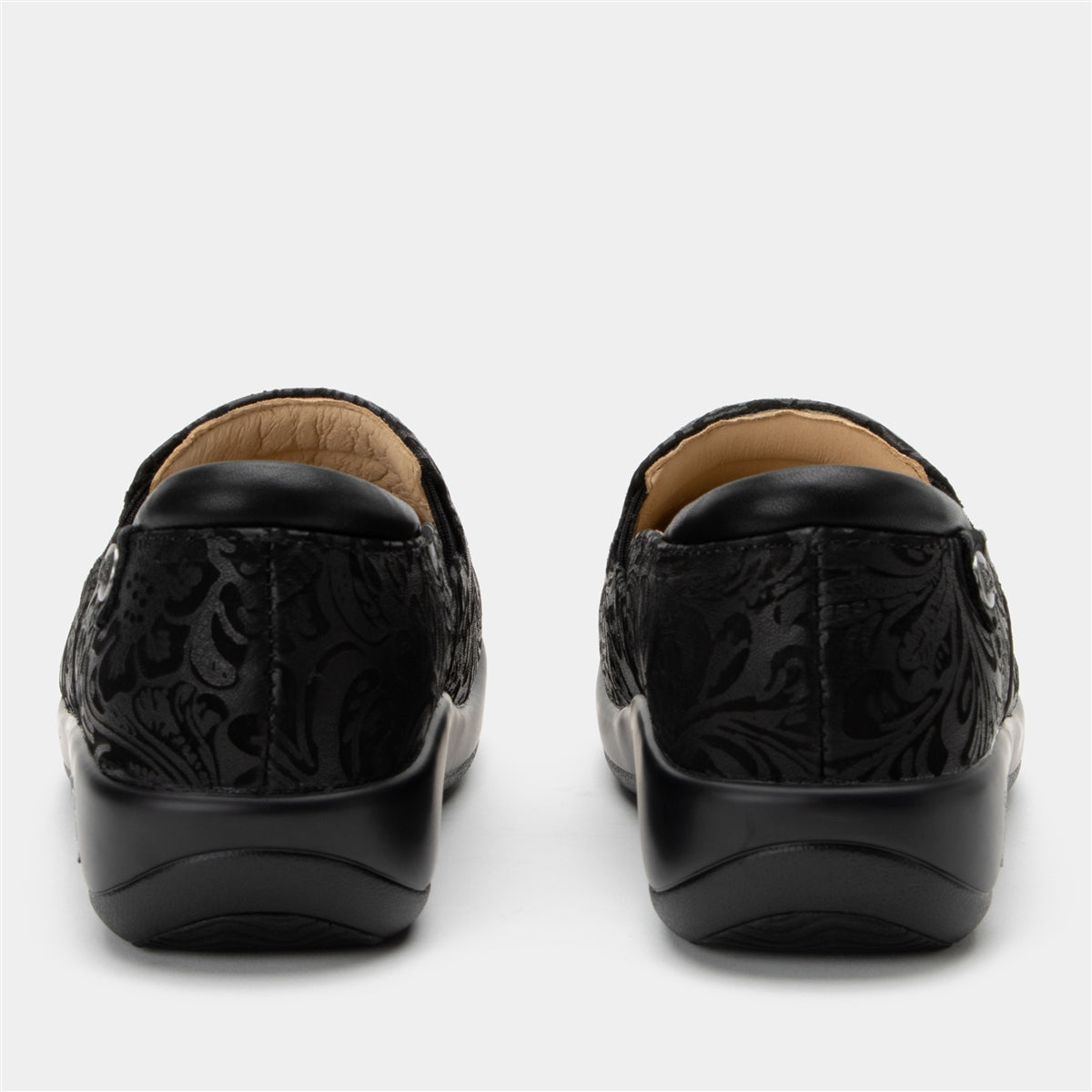 The Alegria Keli PRO Black Emboss Paisley brings a little pizzazz to your basic black loafer. The elastic goring at the instep and padded collar provide an extra comfortable fit. It also features the patented Alegria insoles made of cork, memory foam and leather covered latex. This combination allows the insole to form to your foot creating a custom fit and amazing comfort.