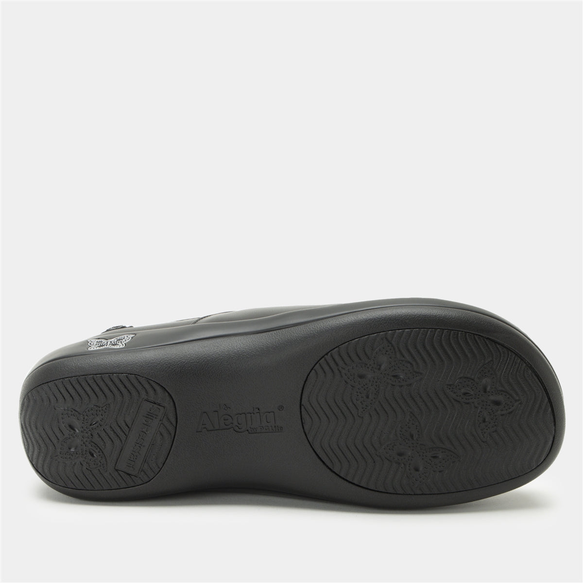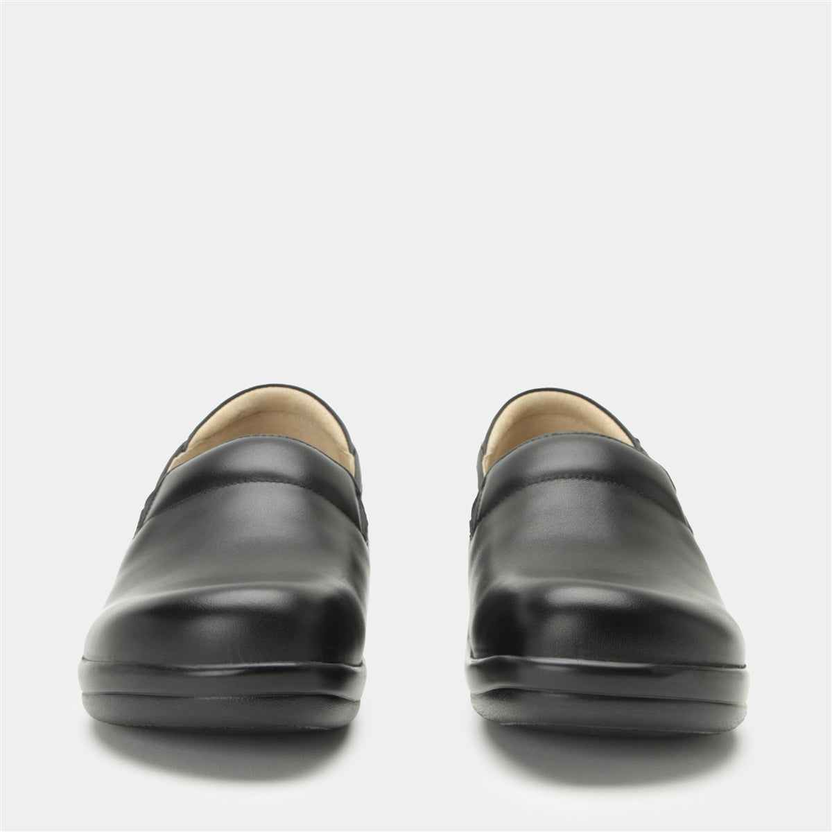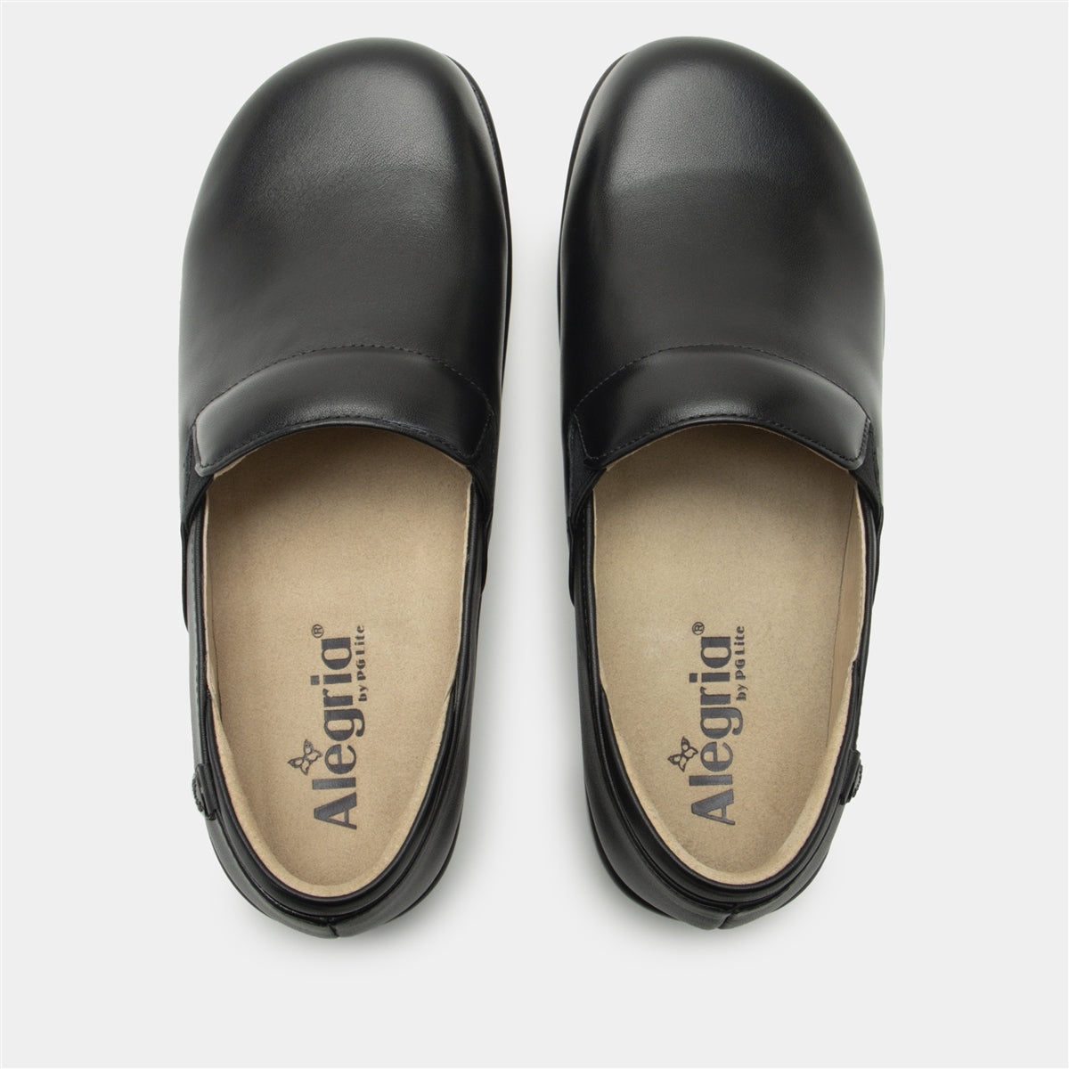 Sometimes you just need a good, simple, comfortable shoe. A shoe that will go with everything. Not to fancy, not to glitzy, just a great shoe. That describes the Keli PRO Black Nappa. It features full foot coverage with a closed back, and a slip resistant outsole as well as stain resistant upper that is lighter weight with a slim silhouette. The elastic goring at the instep and padded tongue provide an extra comfortable fit. Loaded with cork, memory foam and latex, the removable footbed forms to the natural contours of your foot creating a custom fit and amazing comfort.Additional Benefits: