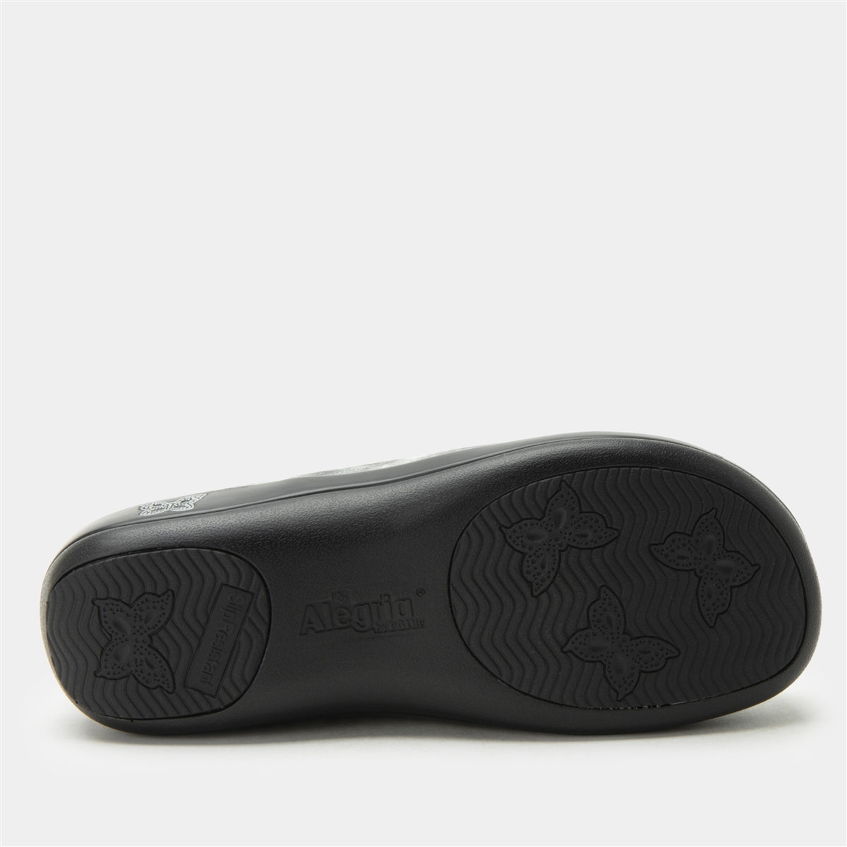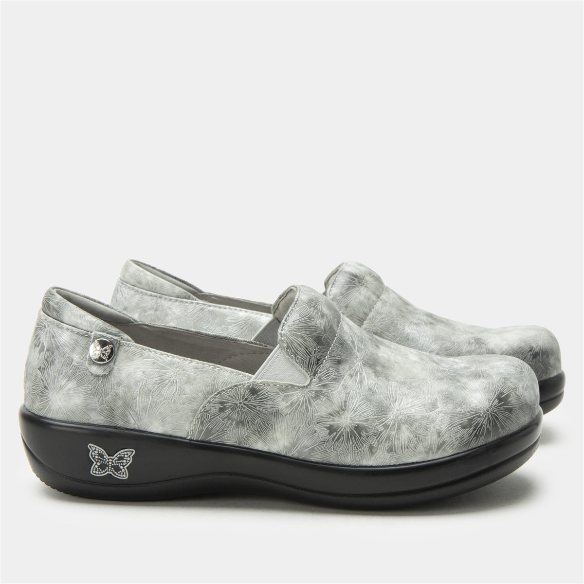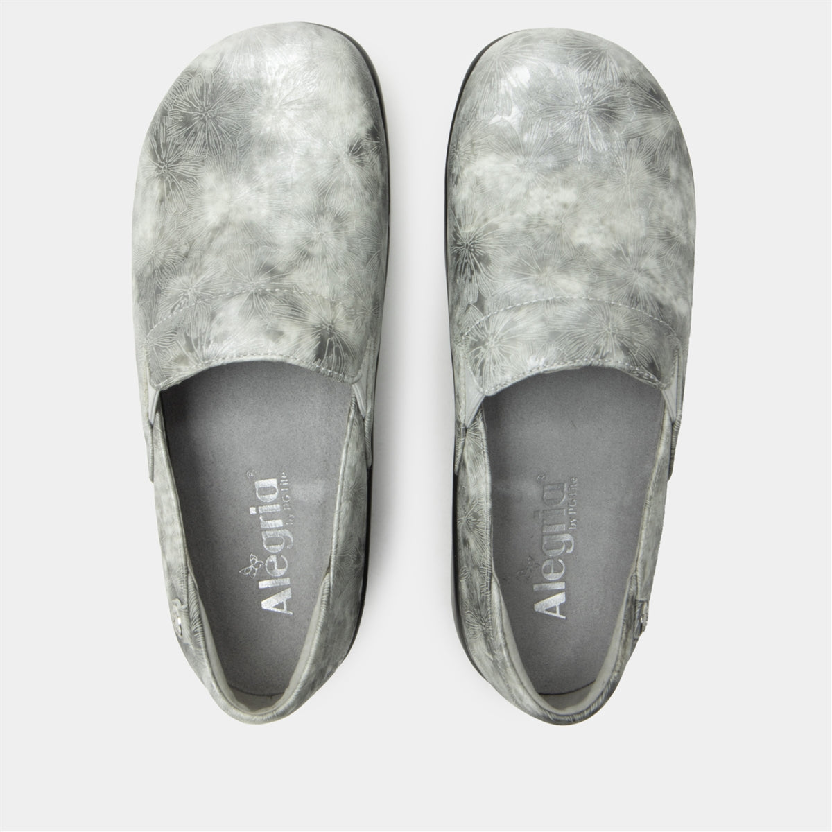 The Alegria Keli Stellar Silver blends subtle shimmer with cloud-like comfort, perfect for professionals who want polish without sacrificing support. The stain-resistant leather upper features a soft silver pattern with a hint of texture and shine, adding quiet elegance to your workday. Easy slip-on access comes courtesy of double elastic gores, while a padded collar cushions the ankle. The patented Alegria footbed is removable and replaceable for custom comfort, and the slip-resistant outsole delivers stability with a 1 1/4-inch heel height.Features you will find in all Alegria Keli shoes: