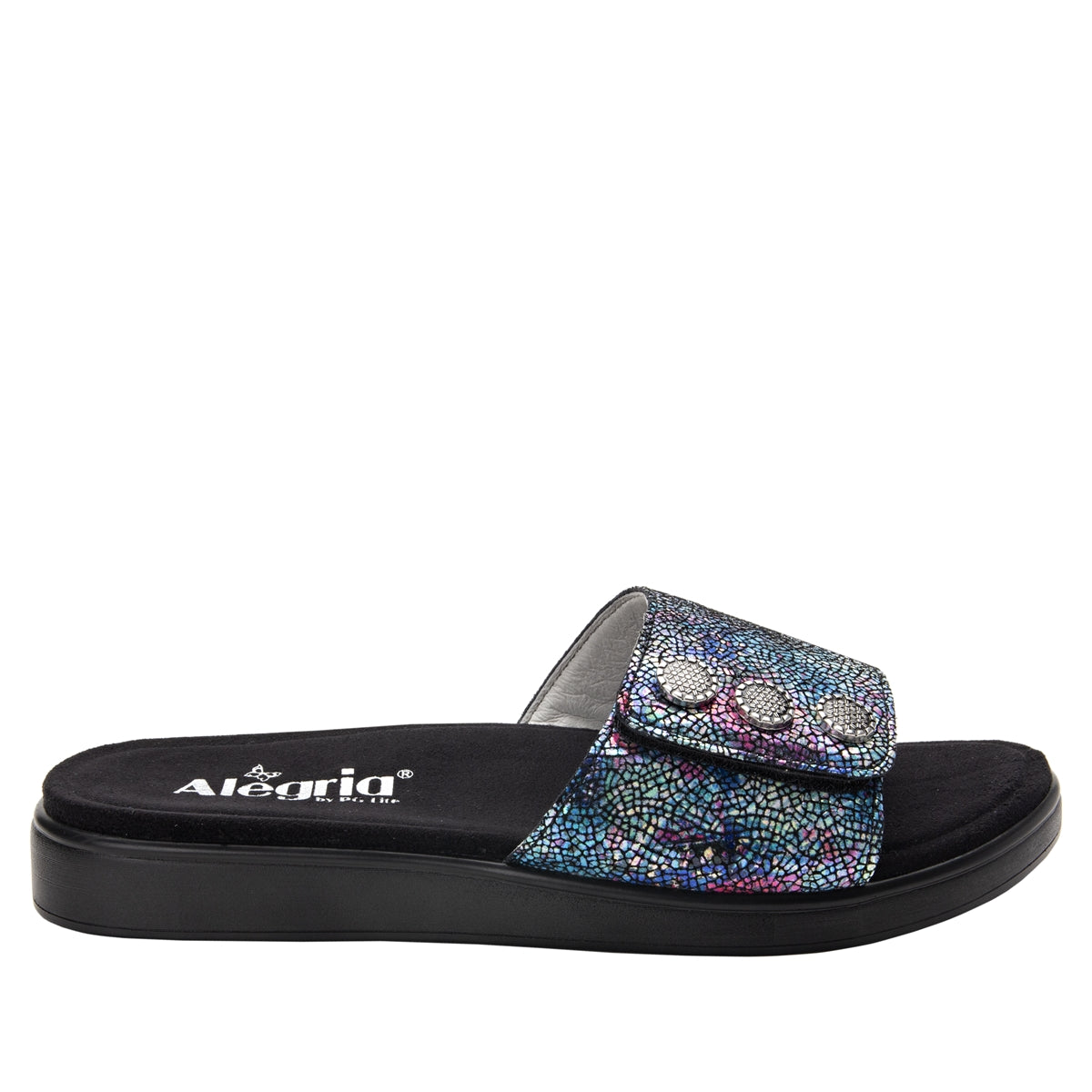 The Lilie is a flat slide on our lightweight slip-resistant outsole with adjustable hook-and-loop closure. The footbed is wrapped in soft, durable microsuede, and has everything you love about our Classic footbed. The Alegria Lilie Copacetic offers all-day comfort all season long!