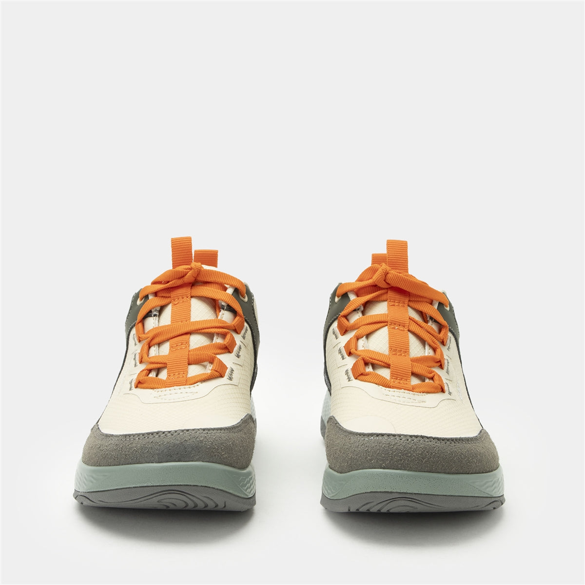 Bright orange laces pop against the earthy tones of the upper, adding a vibrant touch to the sleek design. Orange accents continue on the inner mesh lining and heel loop for a coordinated, eye-catching look.