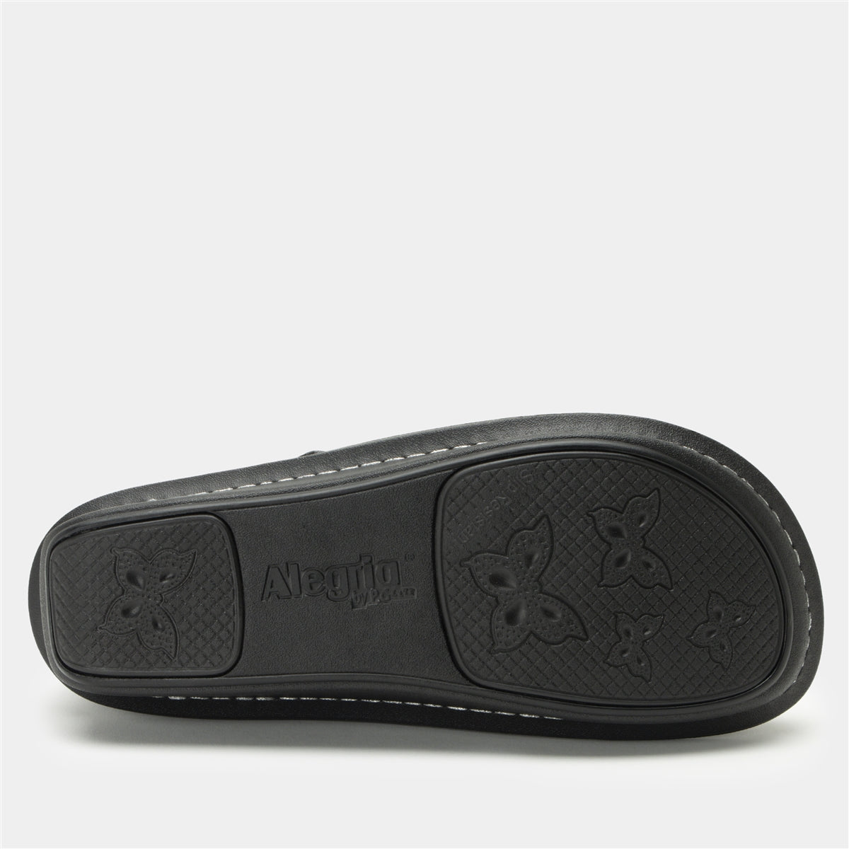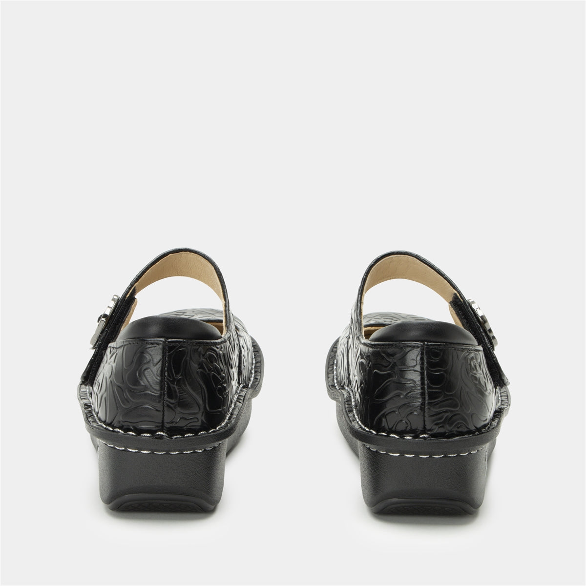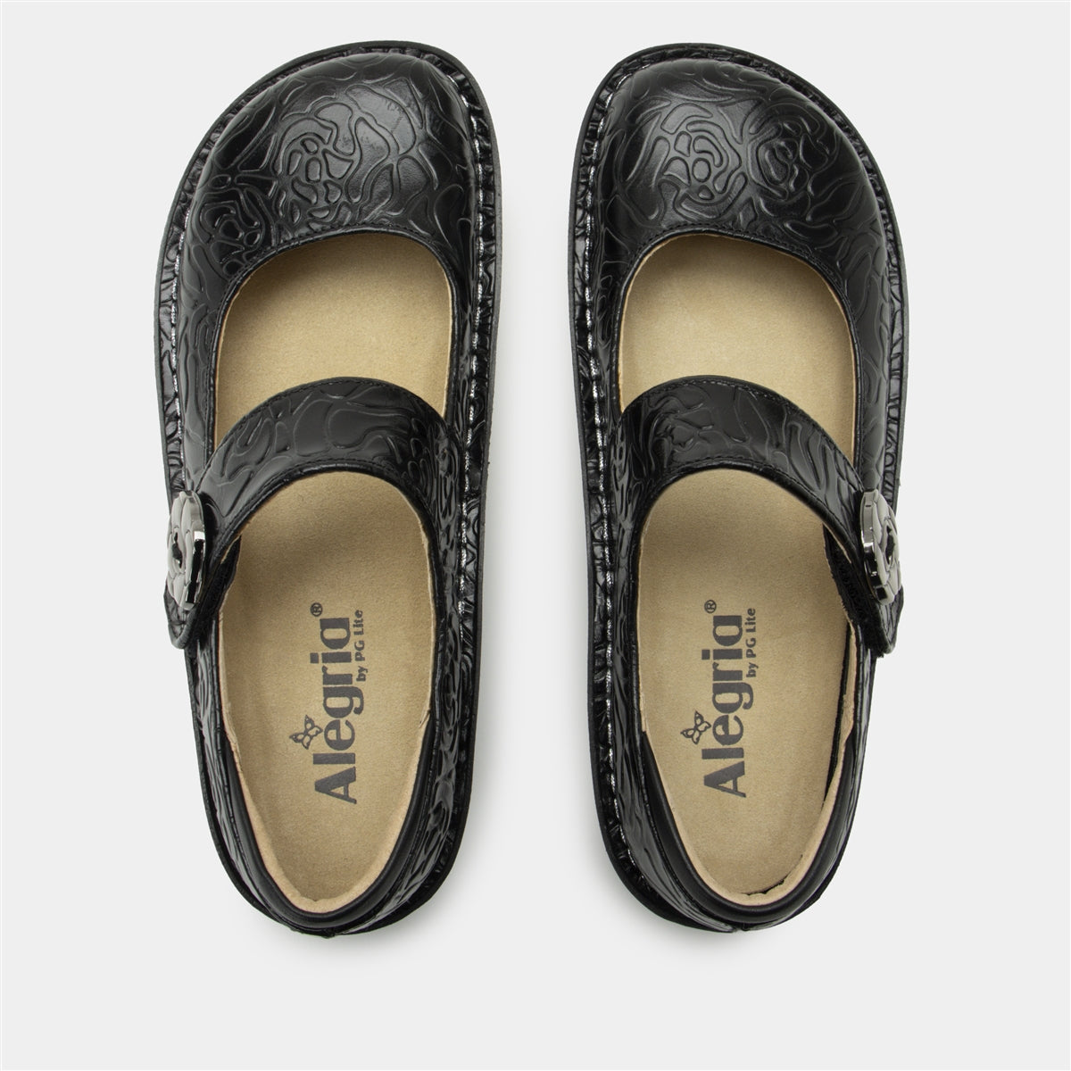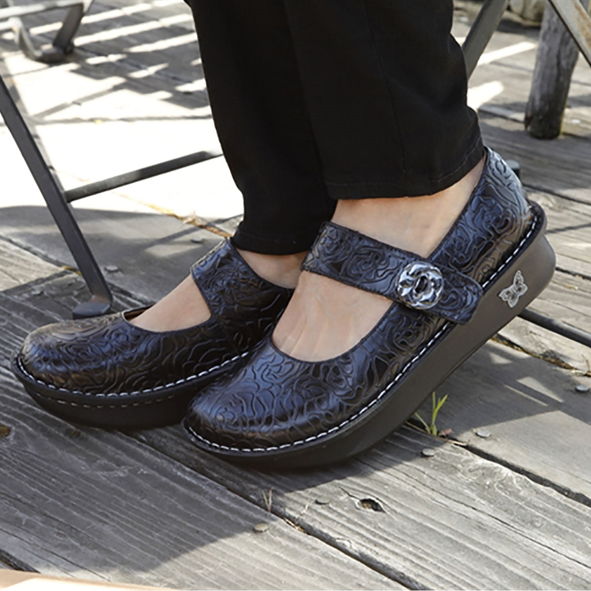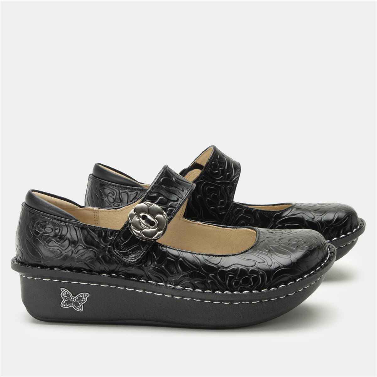 The Alegria Paloma Black Embossed Rose is one of the most asked for at Alegria Shoe Shop. This Paloma is work friendly and casual appropriate. You can't go wrong. The Alegria Paloma Black Embossed Rose is a polished black leather with floral embossing etched in the napa leather. This Alegria Paloma also features silver stitching and a silver floral side button to conceal a velcro closure strap allowing for greater adjustability. The unparalleled comfort of the Alegria Paloma PRO Feathers mary jane shoe comes from many unique features such as: