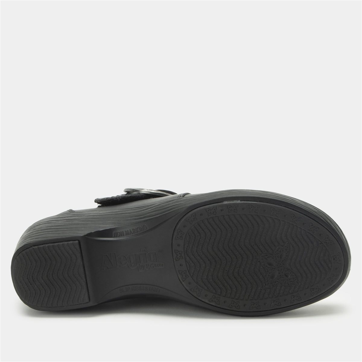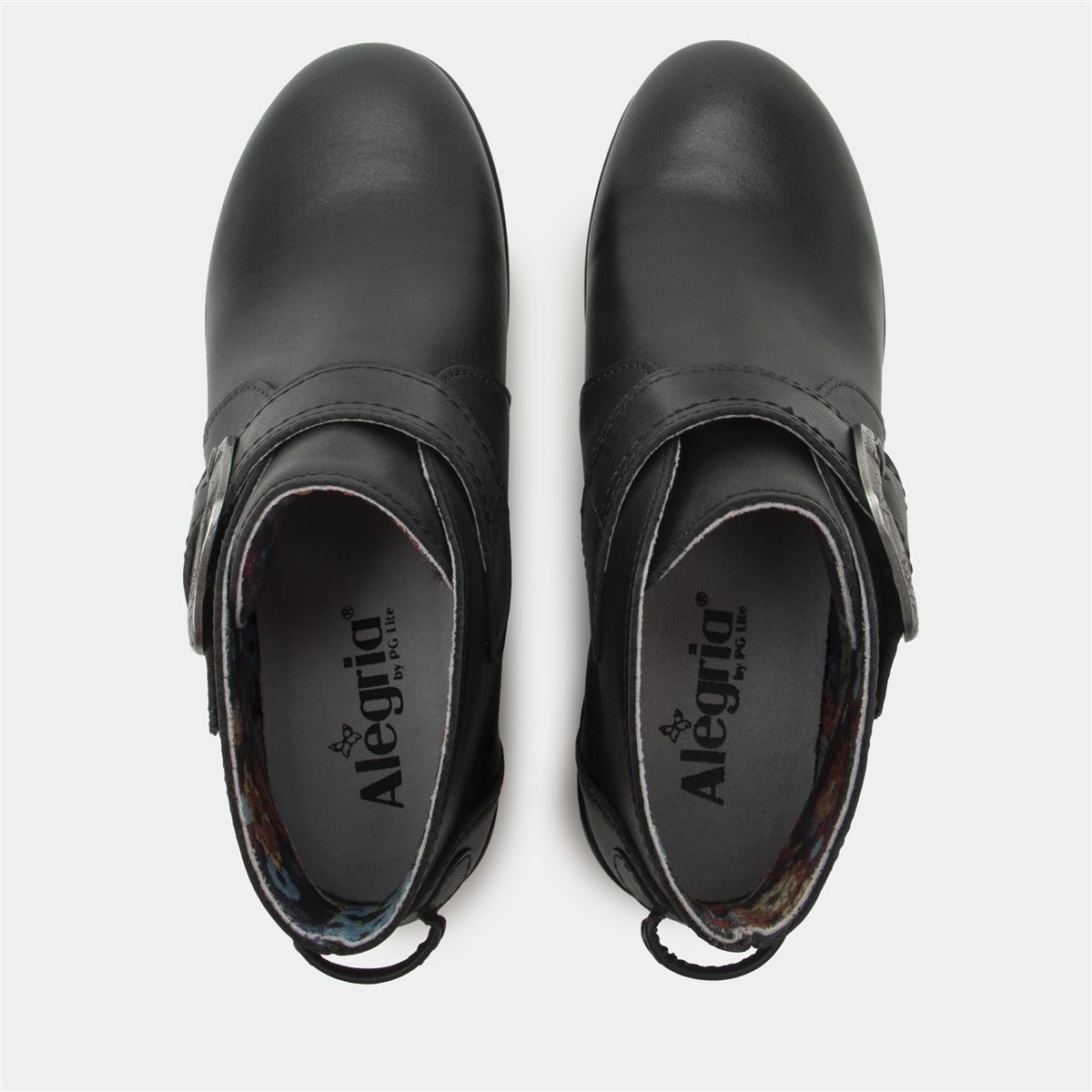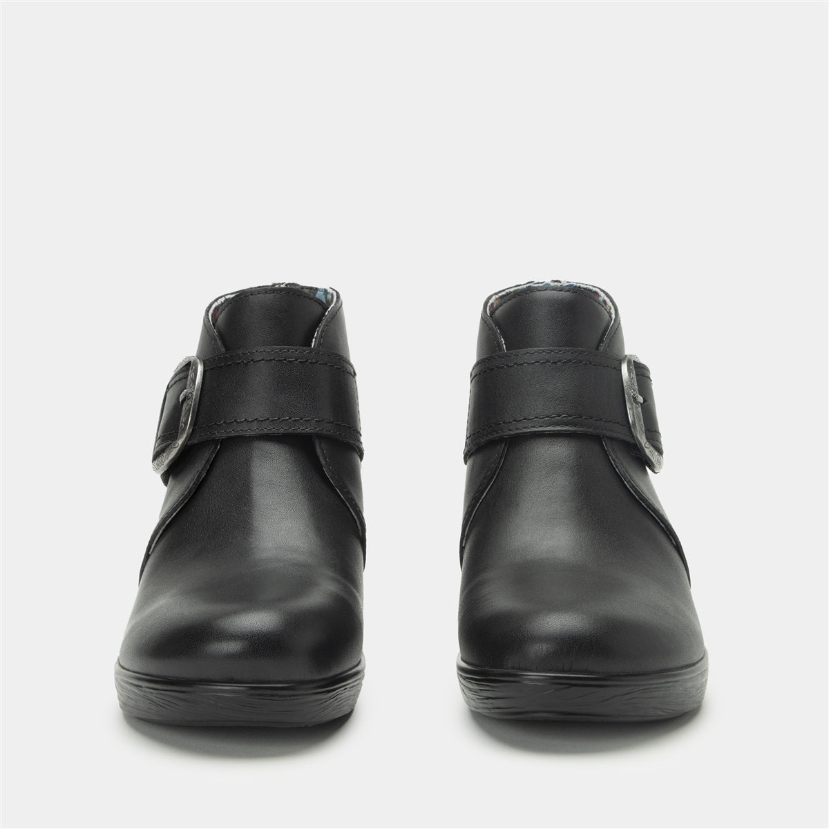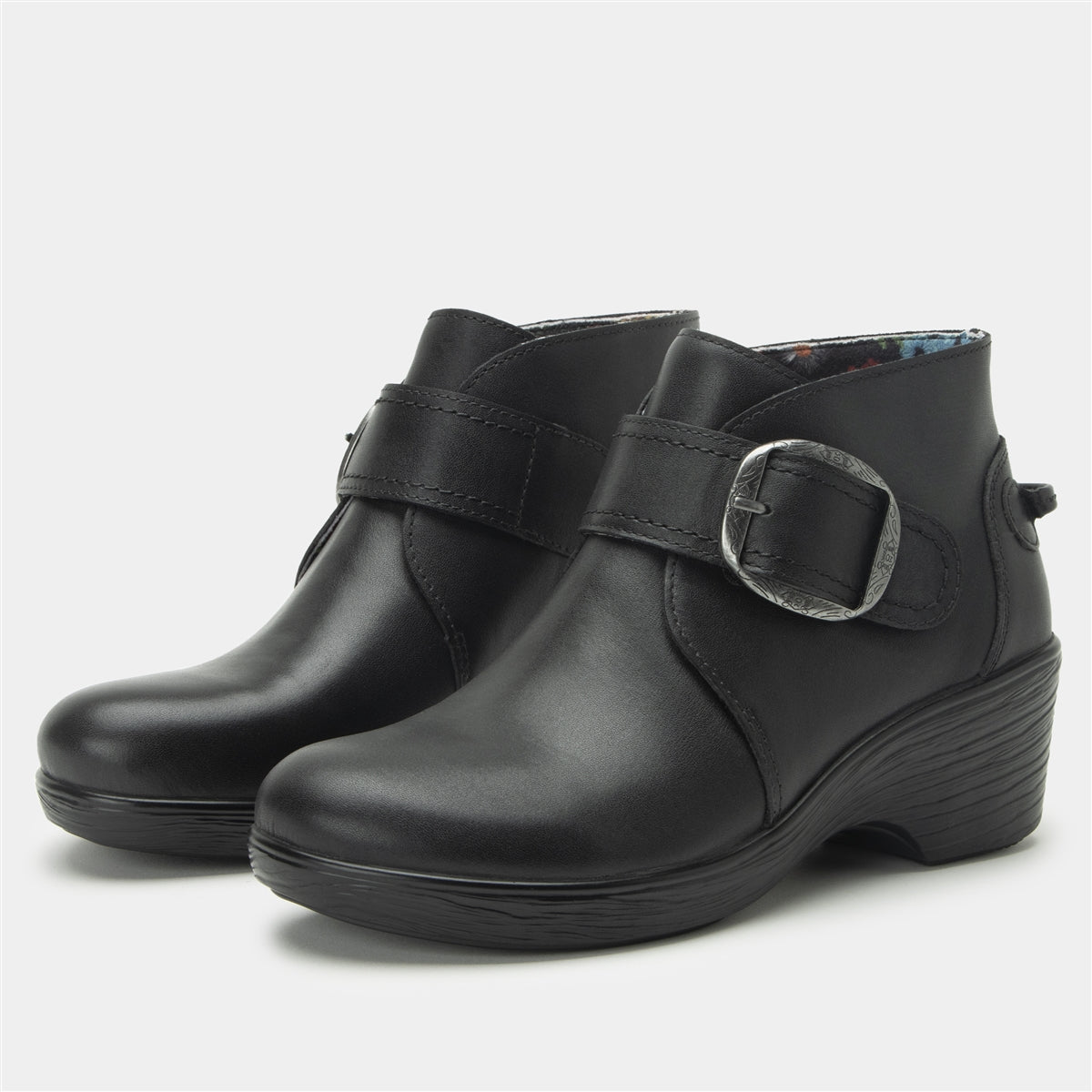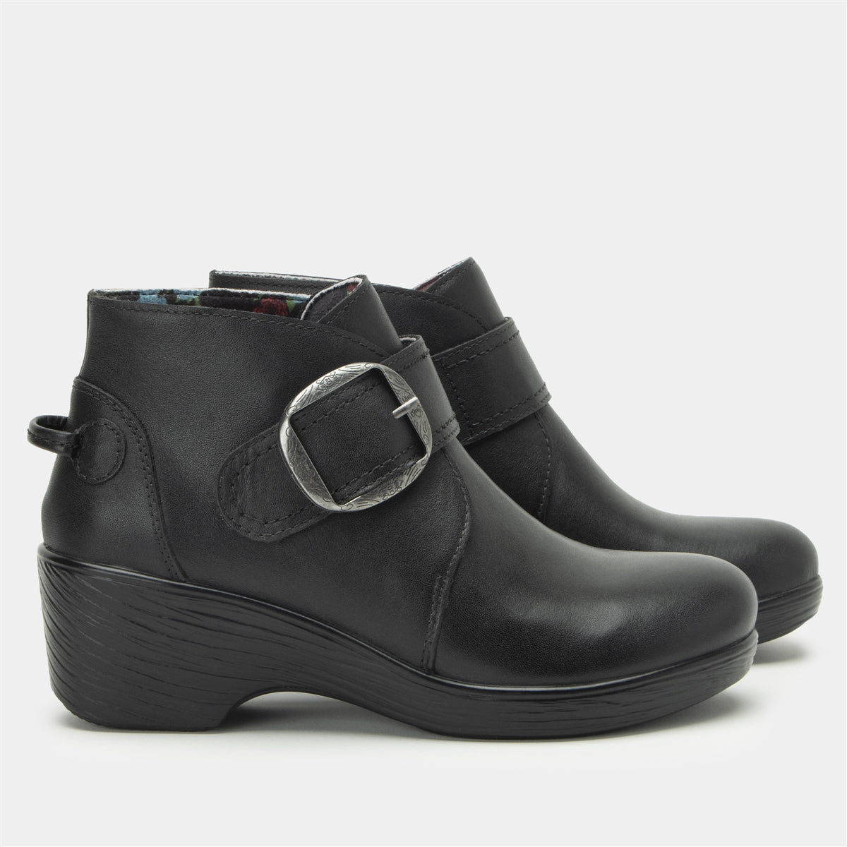 This leather ankle boot with a convenient back pull tab is detailed with a lightweight wood-look slip-resistant wedge. It features an adjustable hook-and-loop strap finished off with a bold metal buckle. The removable suede-lined footbed is made of polyurethane, cork, and memory foam.
