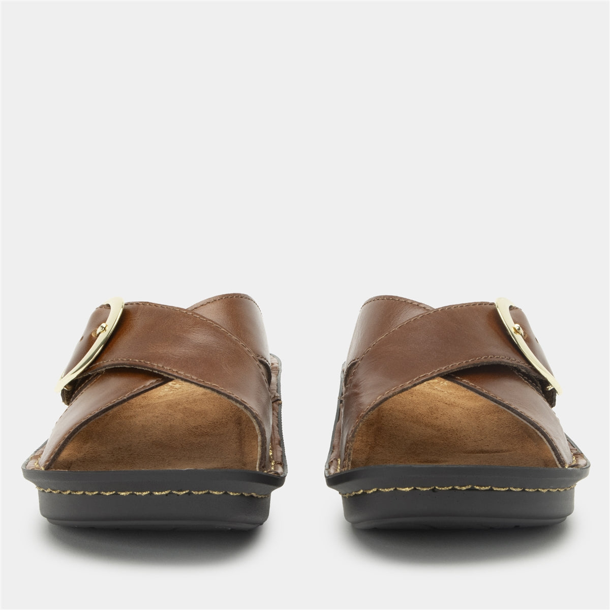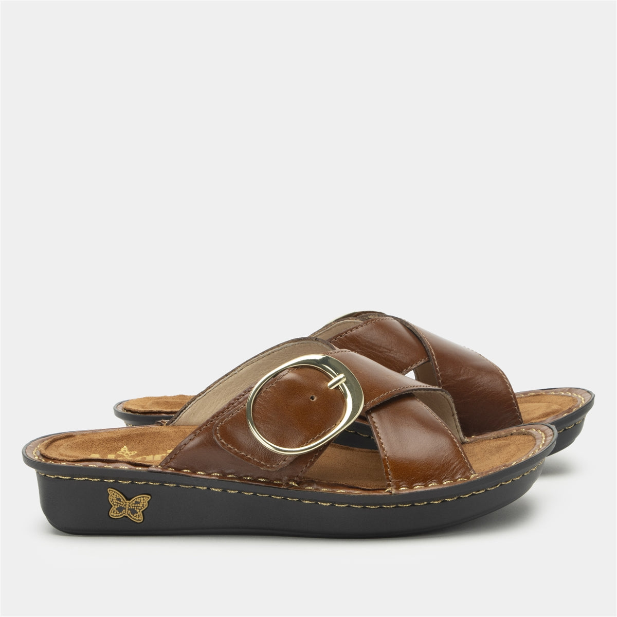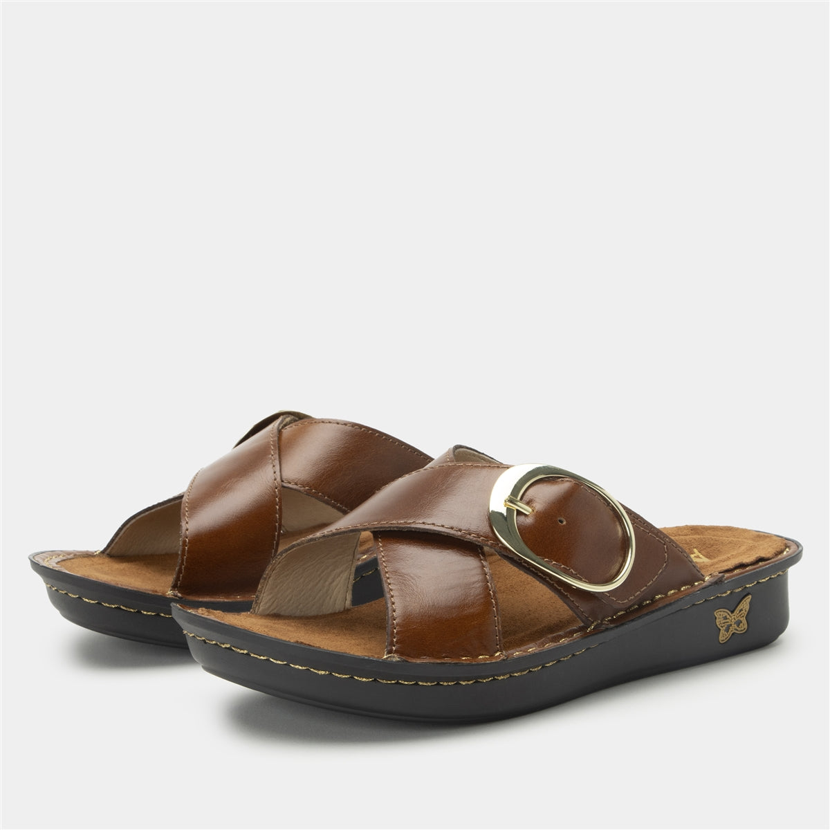 The classic crisscross sandal takes a bold step forward in this handstitched version with an ornamental buckle set on an adjustable hook-and-loop strap. A removable contoured footbed made of cork and memory foam, seamlessly fits into a mini outsole for walking ease. For added versatility, choose from uppers in textured calf hair or smooth leather.Features you’ll find in every Alegria Vanya sandal style include: