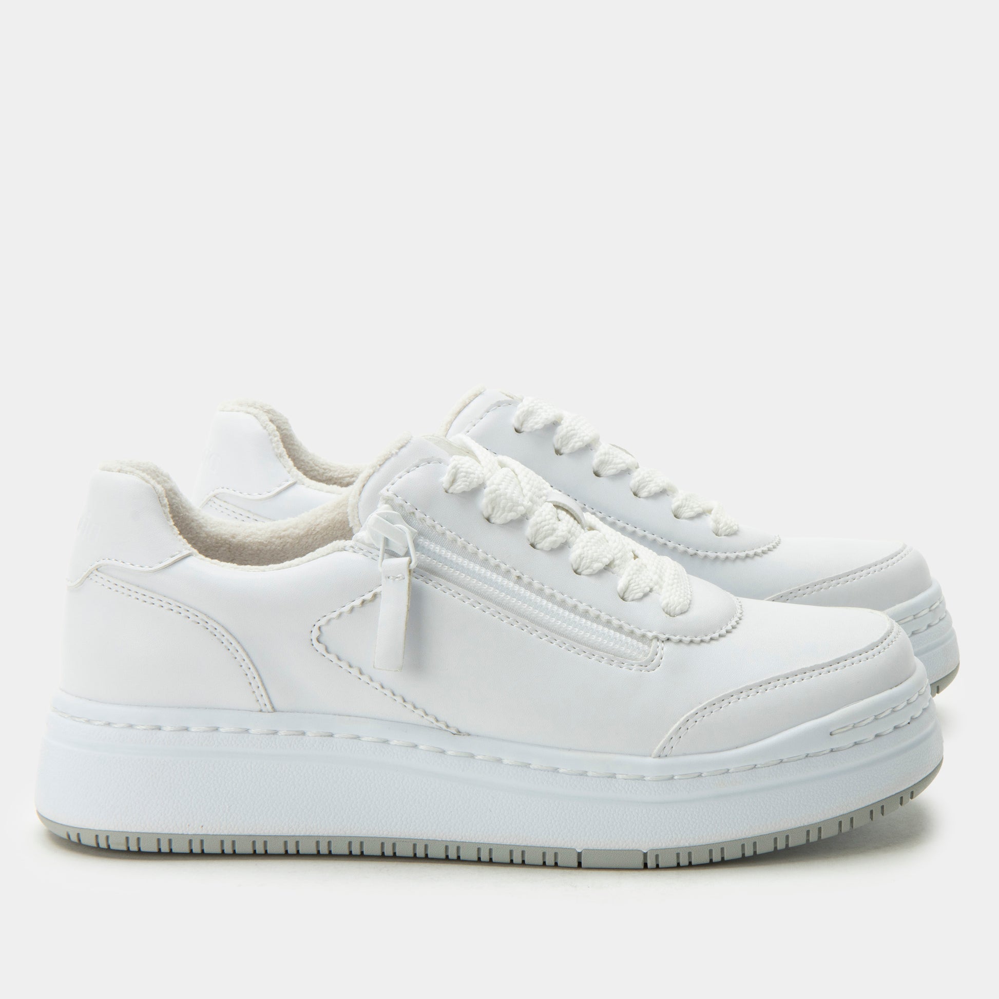 Step into fresh, versatile style with the Alegria Averie in Retro White. This modern sneaker pairs a lightweight, slip-resistant EVA outsole with a smooth vegan leather upper, accented by a convenient side zipper for easy wear. The Alegria signature comfort system delivers cushioning and arch support for all-day foot health, while the crisp Retro White finish offers a clean, timeless look that complements any outfit.Additional Benefits: