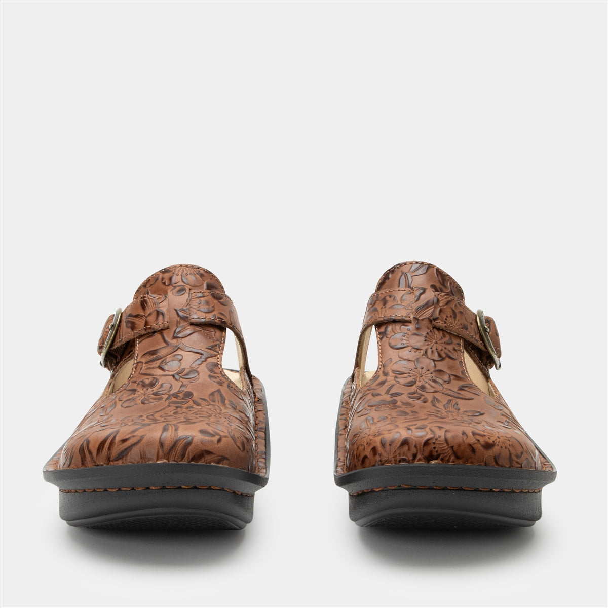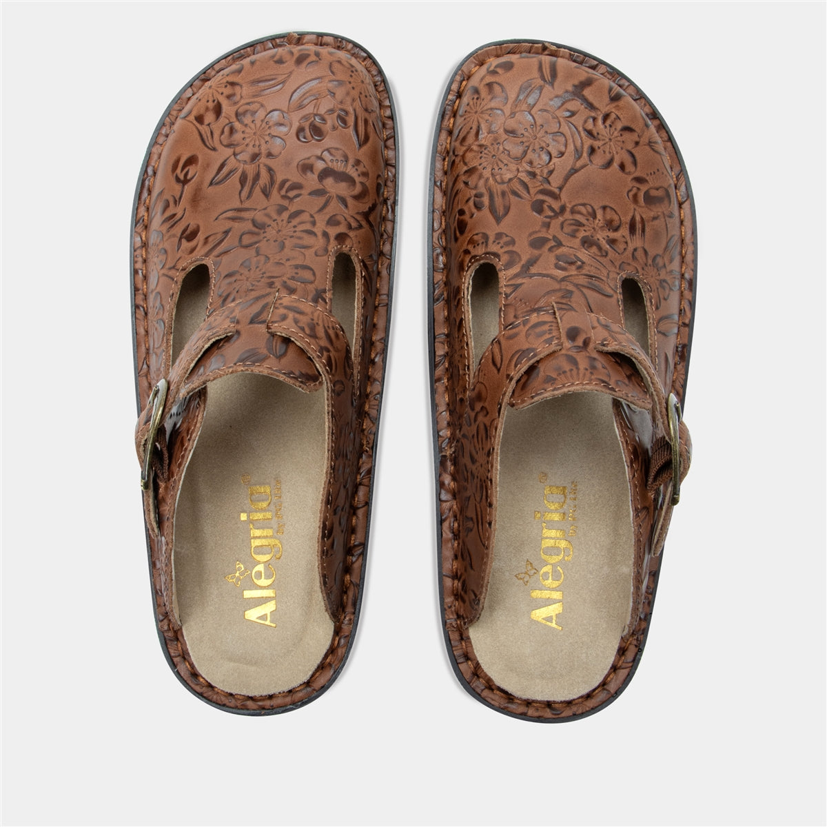 The Alegria Classic in Loretta features a timeless floral leather print in rich, earthy tones, bringing a touch of elegance to this fan-favorite clog. Designed for all-day comfort, it offers relief from foot, back, and knee pain, making it a great choice for those with plantar fasciitis. With a supportive footbed and cushioned feel, this clog is perfect for both work and leisure.