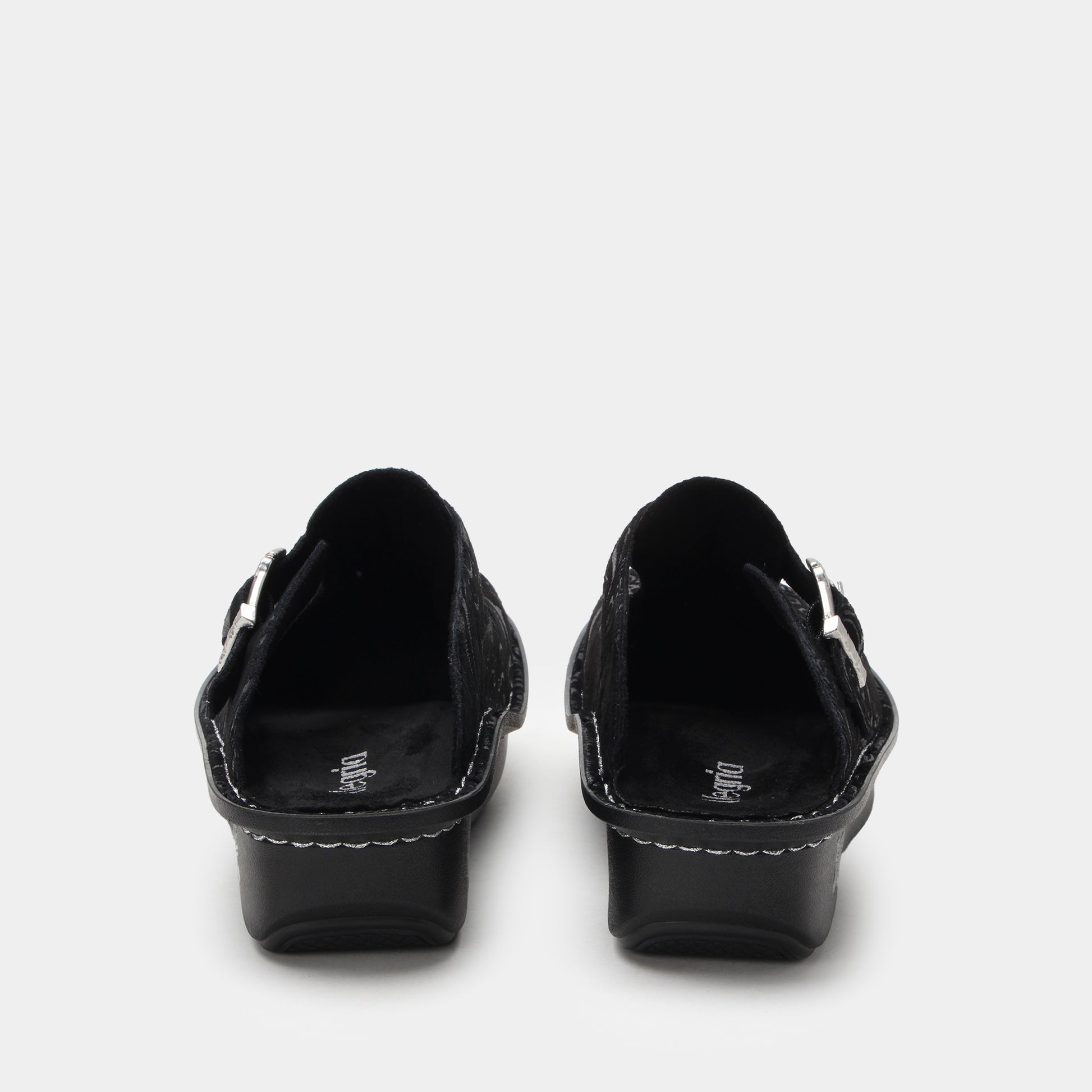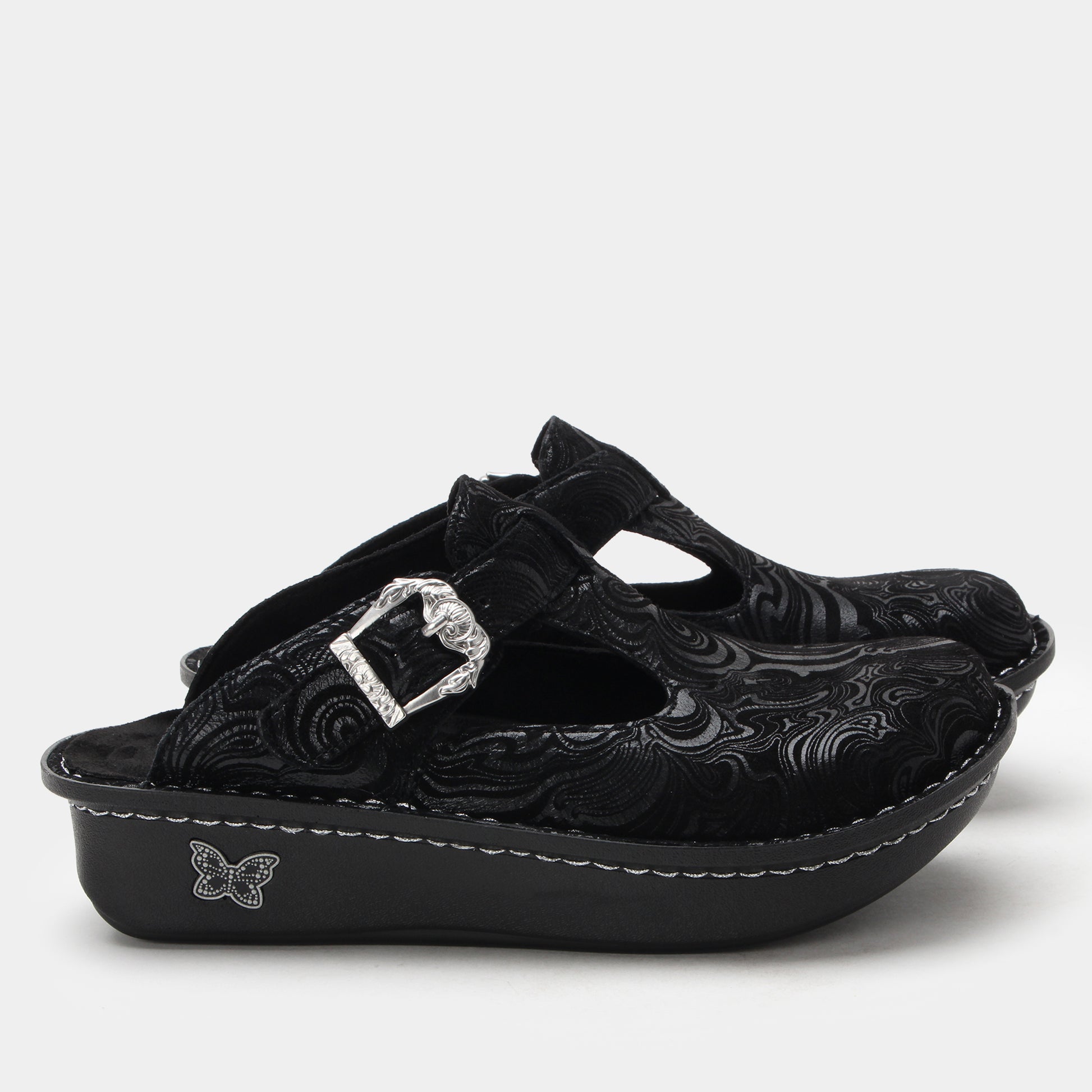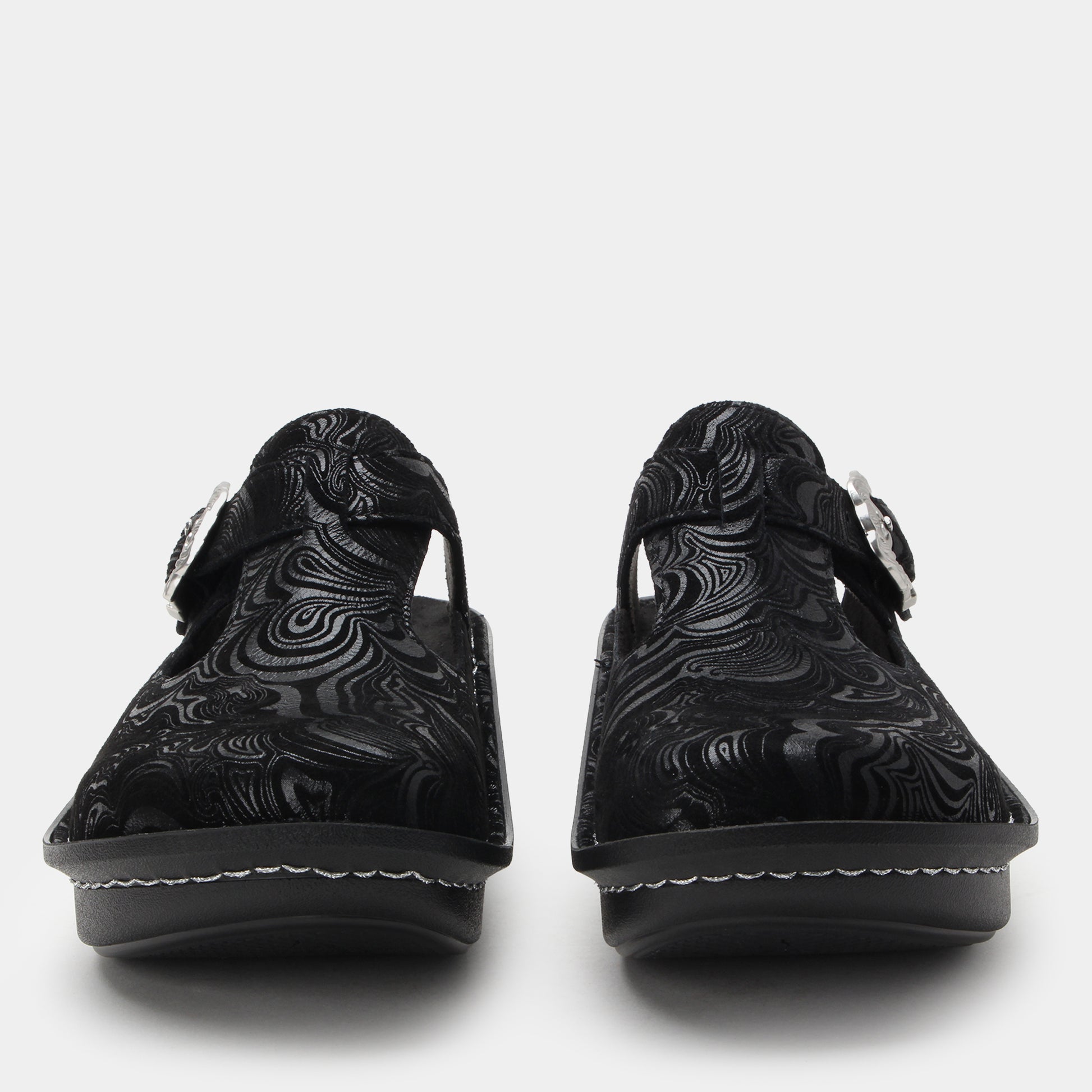The Alegria Classic in Swirling Black is a sophisticated statement in texture and tone. This elegant clog showcases a black embossed swirl pattern on soft velvet-inspired leather, creating subtle dimension that catches the light with every step. Finished with a silver decorative buckle and matte black trim, Swirling Black brings depth and artistry to Alegria’s iconic comfort design — where timeless style meets lasting support.Additional Benefits:
