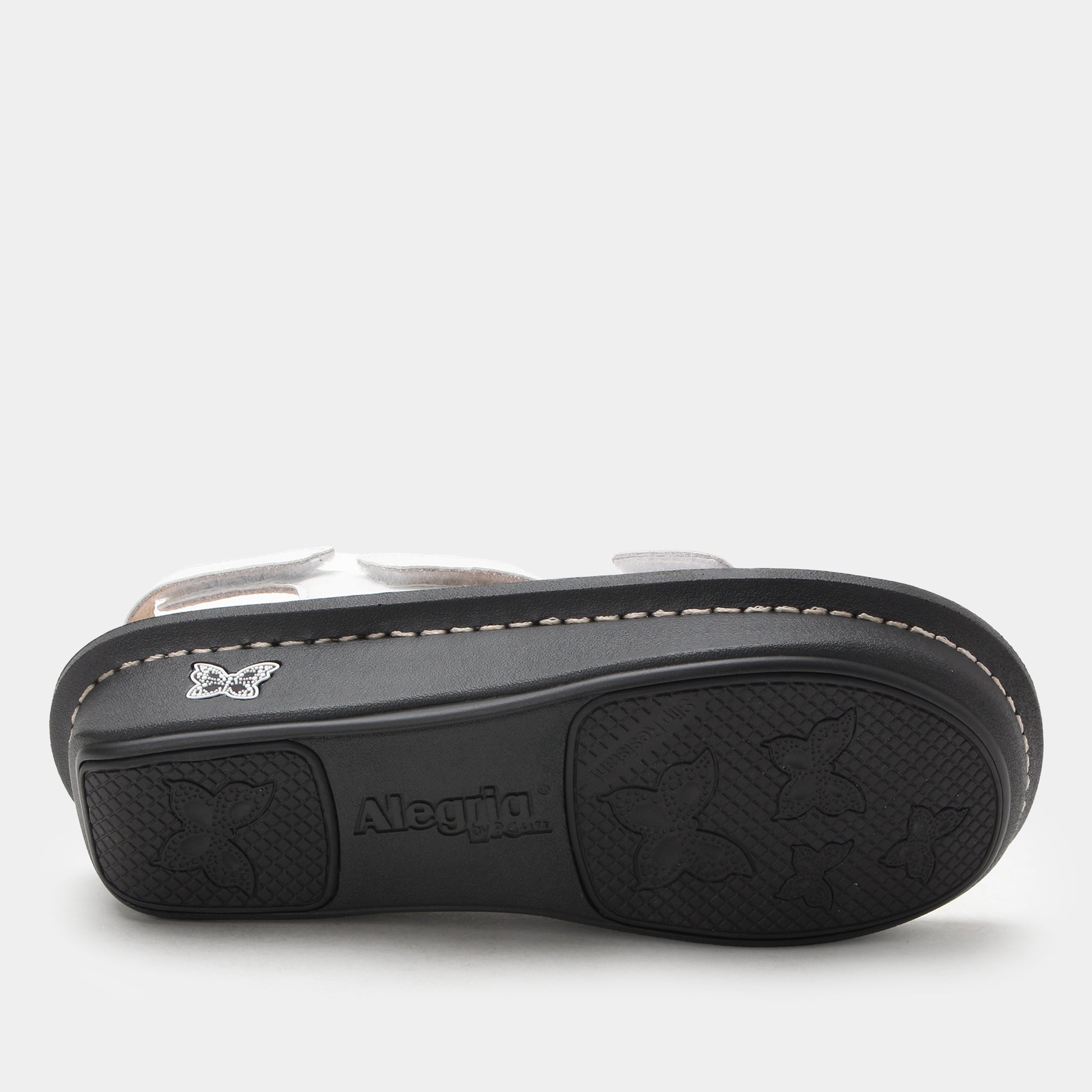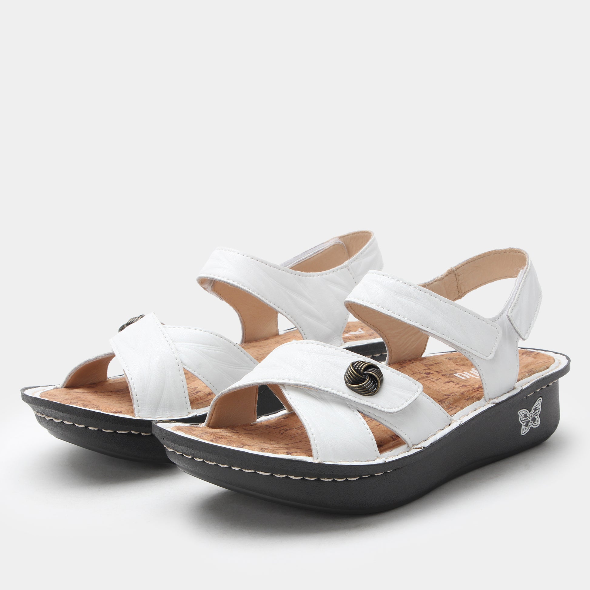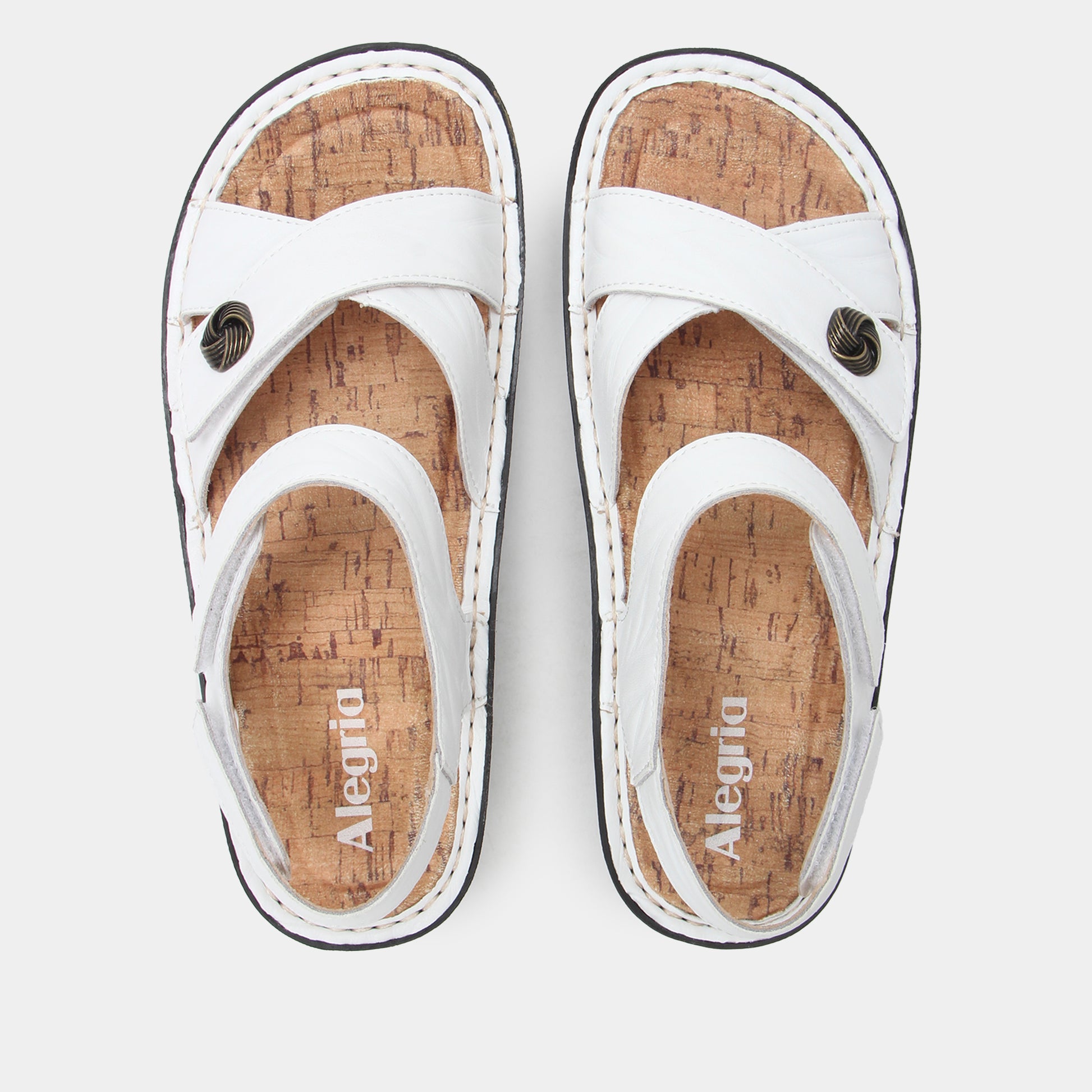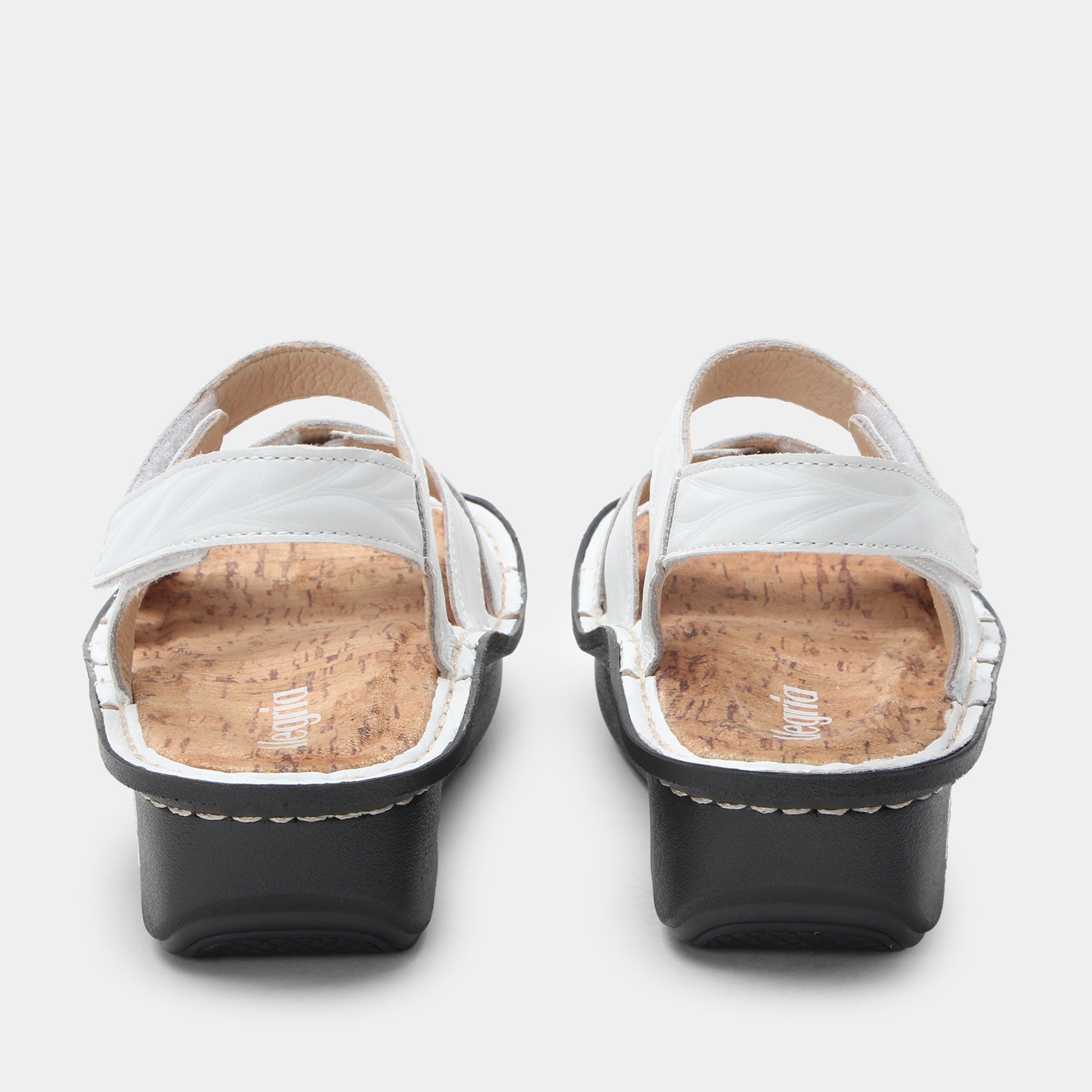 The Alegria Kelsi in Fondly White blends timeless elegance with modern comfort. Crafted from smooth white leather, this versatile sandal offers a crisp, clean look that pairs beautifully with any warm-weather outfit. Three adjustable hook-and-loop straps allow for a custom fit, while a decorative antiqued button accent adds subtle charm. Finished with Alegria’s signature footbed and a lightweight rocker outsole, Fondly White delivers effortless comfort and support with every step.Additional Benefits: