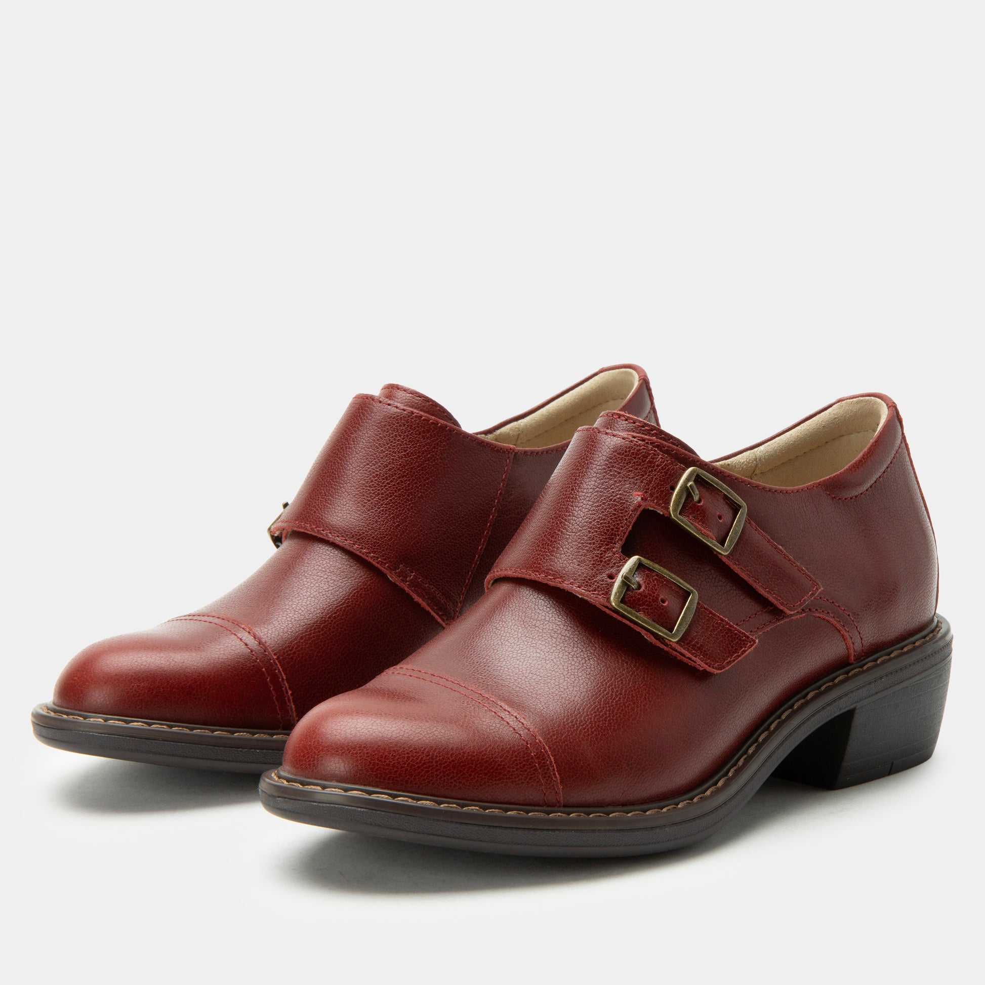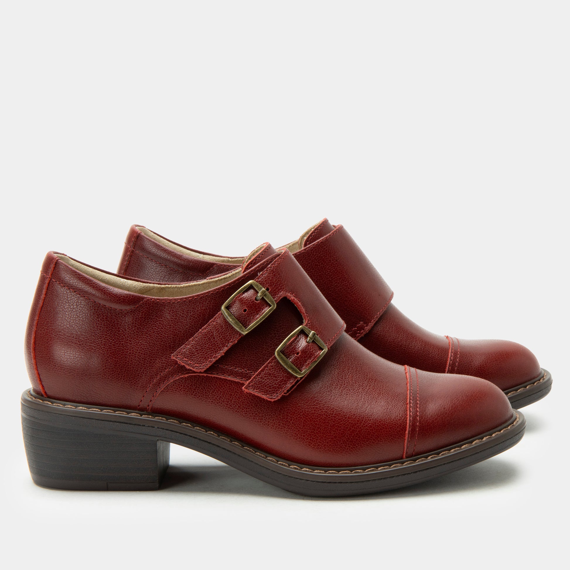 The Alegria Mave in Roja brings tailored sophistication to your everyday routine. This polished leather dress shoe takes inspiration from classic menswear with its double monk strap design and bold red hue, while delivering all the comfort you expect from Alegria. A low, stable heel and slip-resistant outsole make it ideal for workdays or nights out, blending confident style with all-day support.