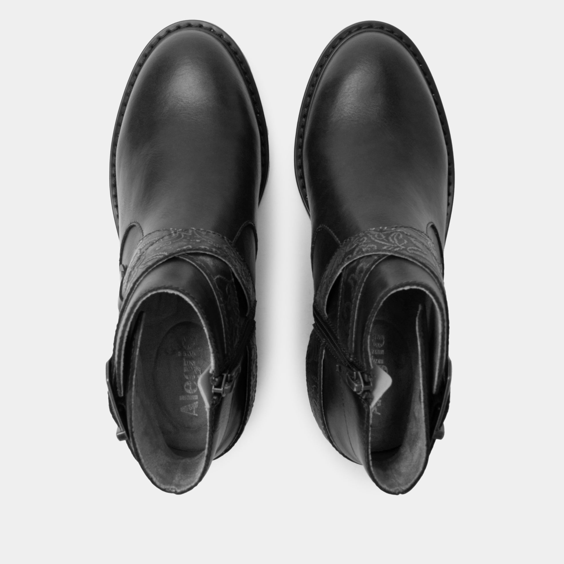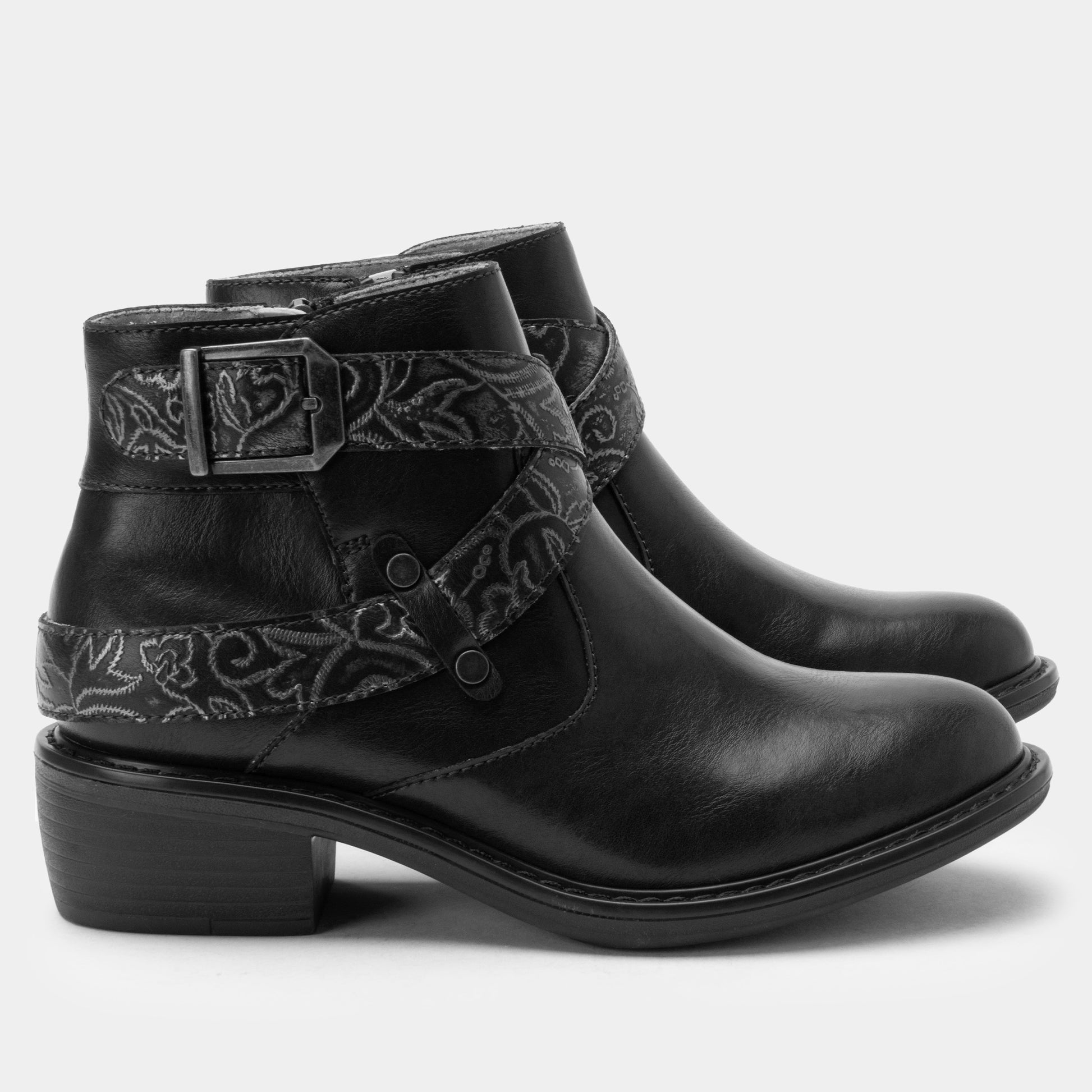 Bold and versatile, the Alegria Millie in Embroider Me Black combines western-inspired design with Alegria’s signature comfort. Crafted from smooth black leather, this ankle boot features embroidered strap accents and a dark burnished buckle that add refined detail to its sleek silhouette. Perfect for dressing up or down, the Millie offers both timeless style and everyday wearability.