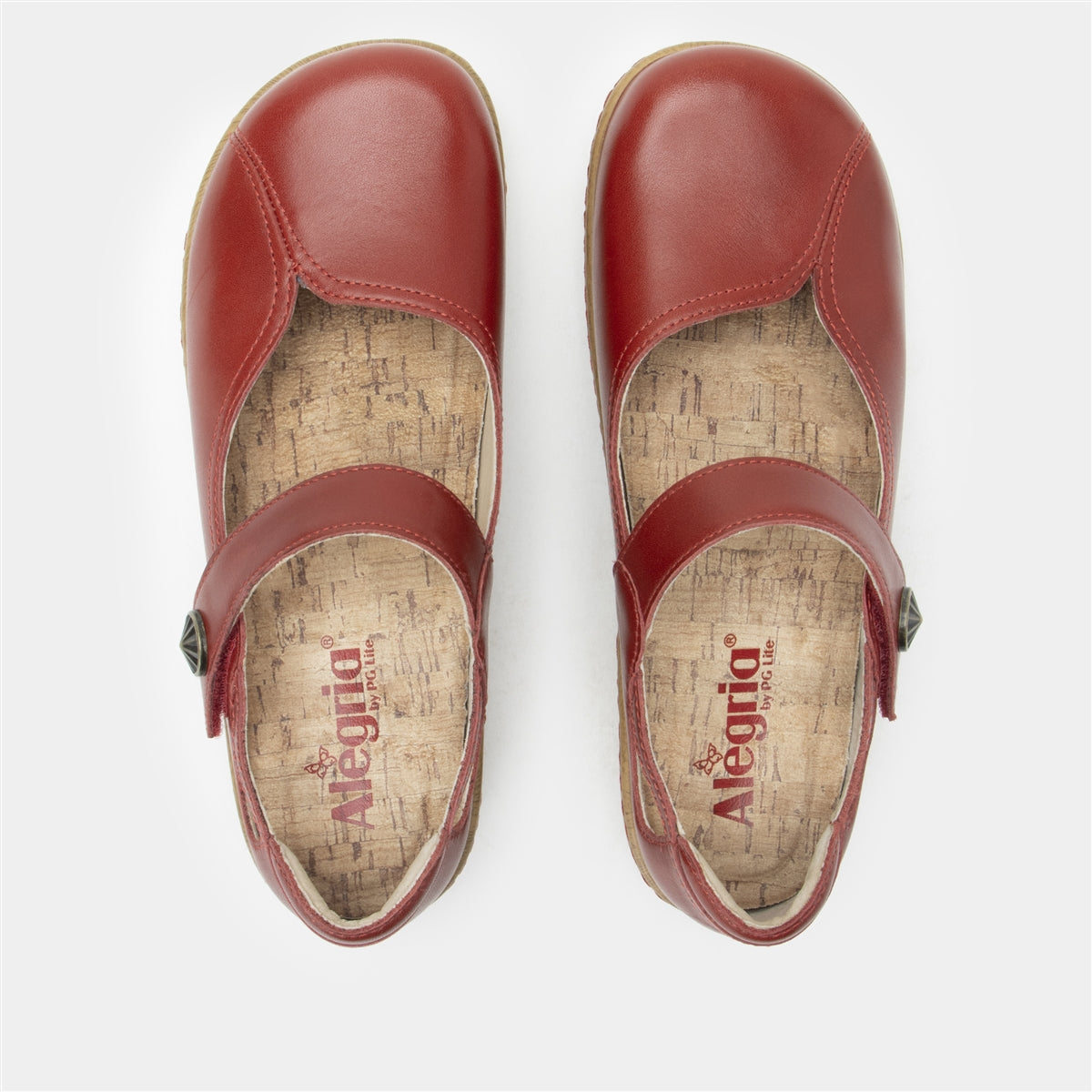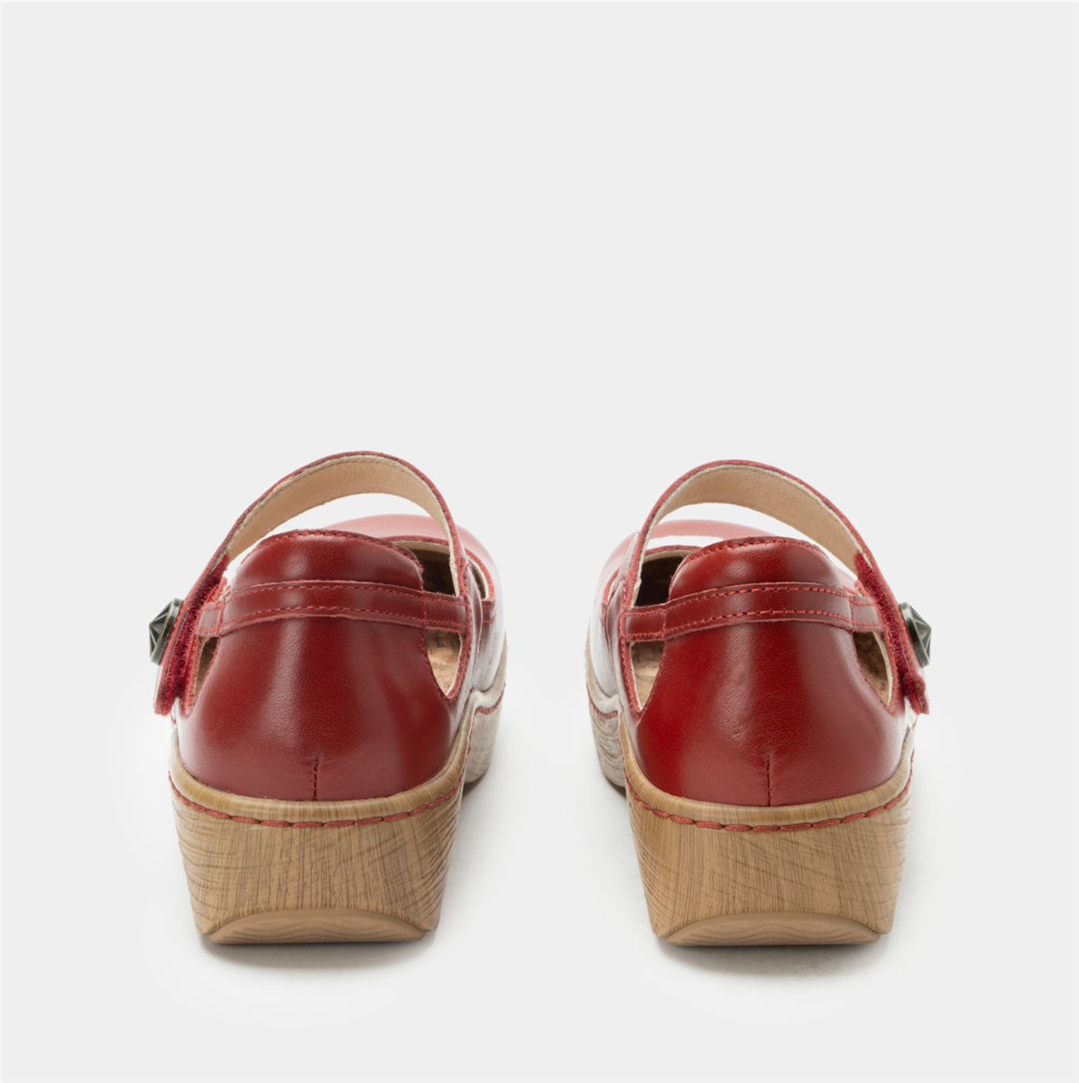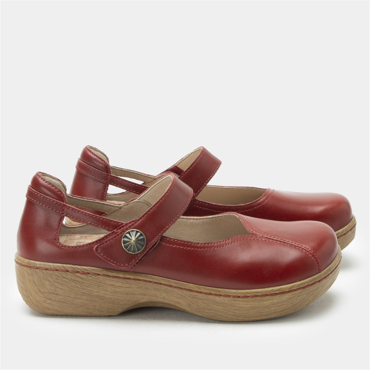 Introducing the Alegria Onika in the vibrant Big Red color, a modern Mary Jane that perfectly balances style and comfort. This version features a smooth red leather upper with a convenient hook-and-loop strap for easy adjustments and a secure fit. Inside, a padded collar and removable microsuede footbed conform to your feet for exceptional comfort. The patented Alegria footbed ensures excellent arch support, while the chic wood-look bottom adds a touch of flair. The Onika offers a sleek and comfortable option, perfect for adding a pop of color to any outfit.Additional Benefits: