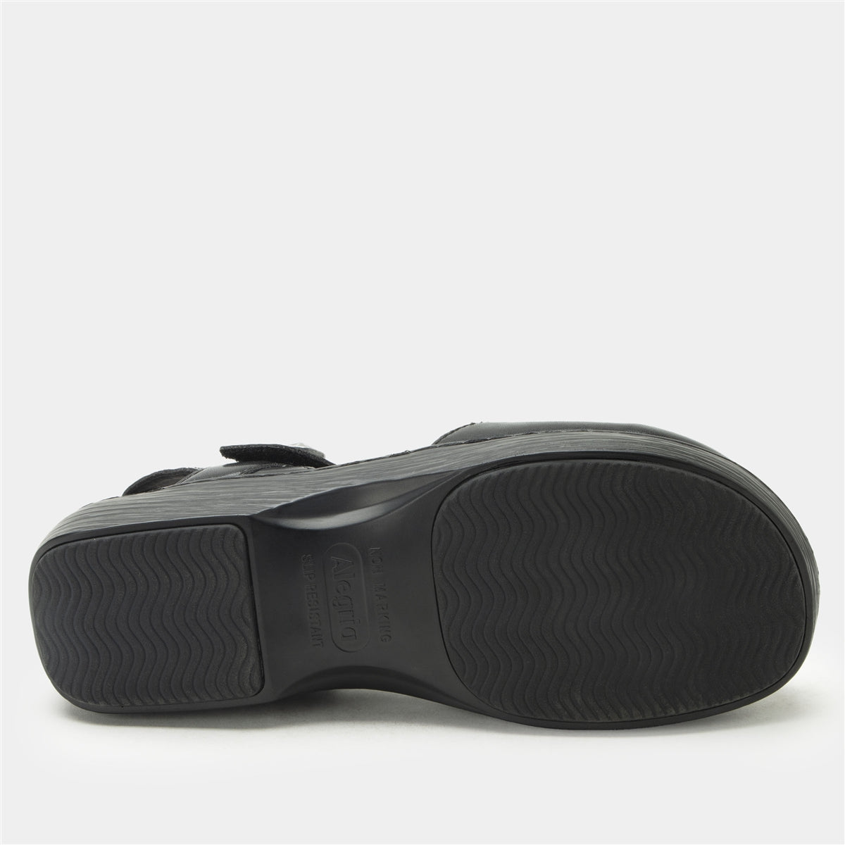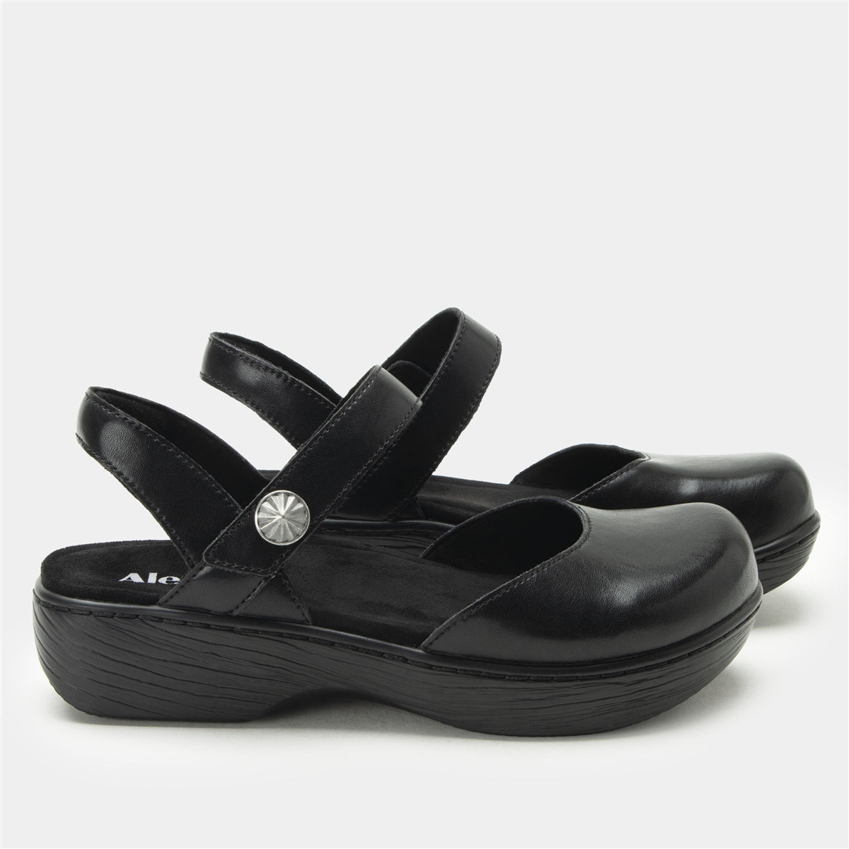 Introducing the Alegria Opal in the deep Ink color, a sleek and versatile slingback Mary Jane designed for effortless style and comfort. This version showcases a smooth, solid navy leather upper, offering a rich and timeless look that pairs seamlessly with any wardrobe. The adjustable hook-and-loop strap ensures a customized fit, while the open-back design enhances breathability and ease of wear. Inside, the cushioned microsuede footbed and padded collar provide exceptional comfort for all-day support. The patented Alegria footbed delivers superior arch support, complemented by a durable and slip-resistant sole. The Opal in Ink is a perfect choice for those who seek understated elegance with lasting comfort.Additional Benefits:
