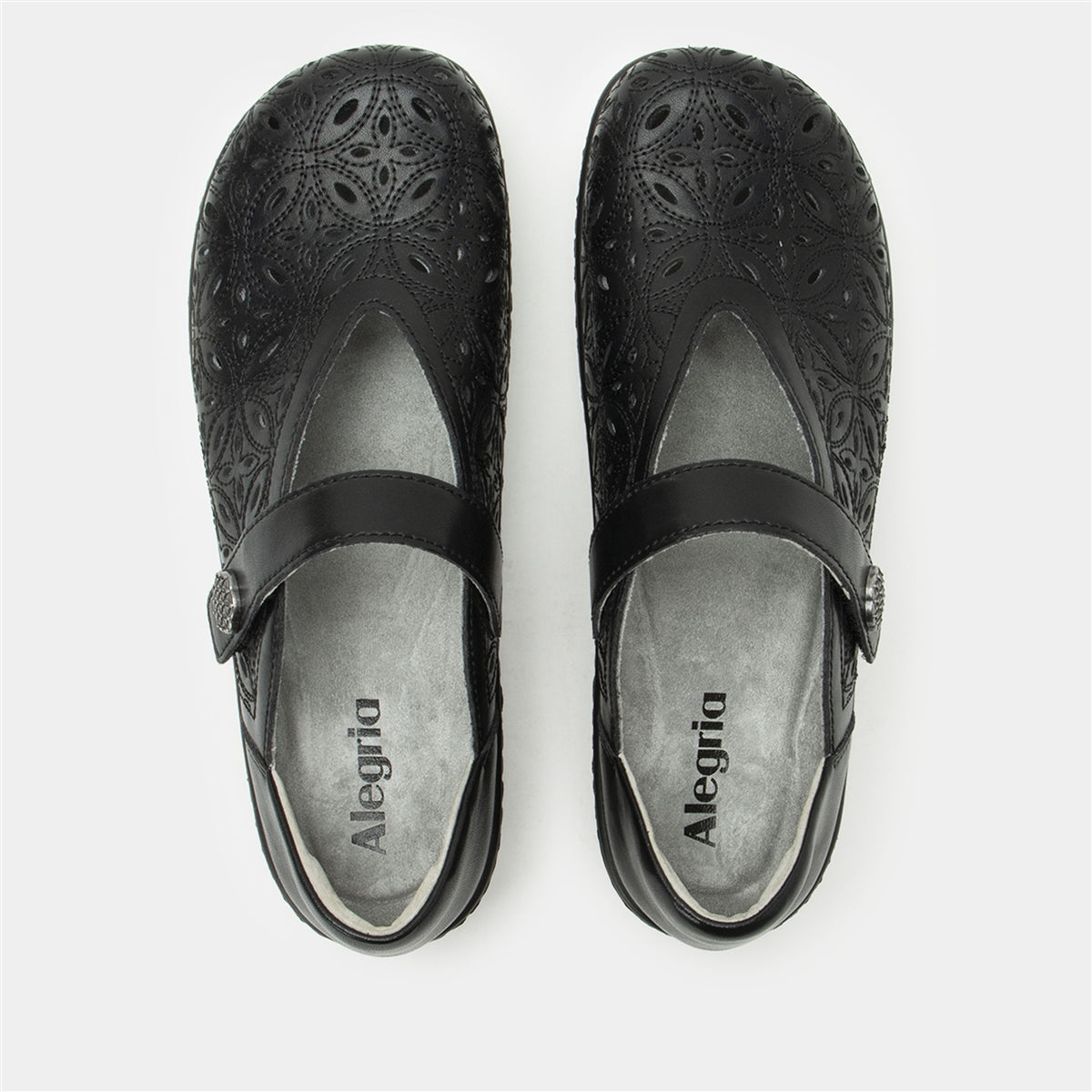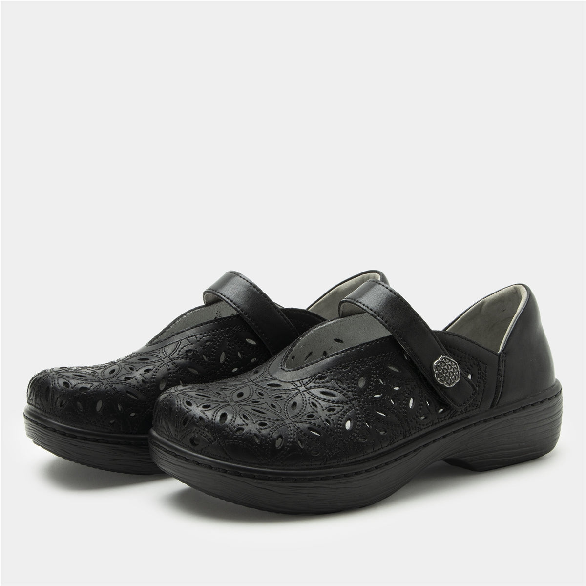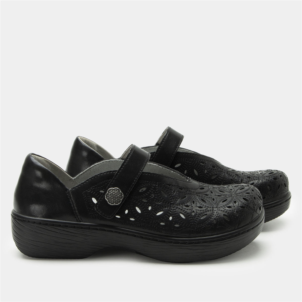 Step into style with the Alegria Ophelia in Black Breeze, a contemporary Mary Jane that combines comfort with a touch of flair. This shoe features a laser-etched leather upper in a versatile black shade, adorned with a breezy design for added elegance. The adjustable hook-and-loop strap ensures a secure and personalized fit, while the padded collar and removable microsuede footbed provide all-day comfort. Built with Alegria's patented footbed, it delivers superior arch support for long-lasting wear. Finished with a sleek wood-look bottom, the Ophelia in Black Breeze is the perfect blend of fashion and function for any occasion.Additional Benefits: