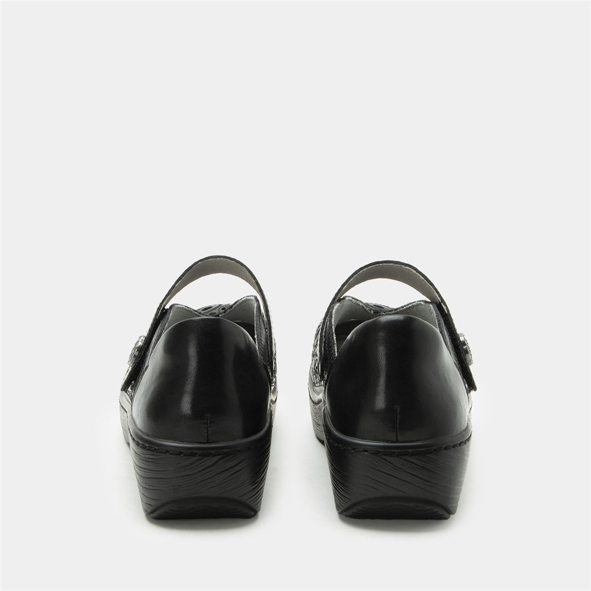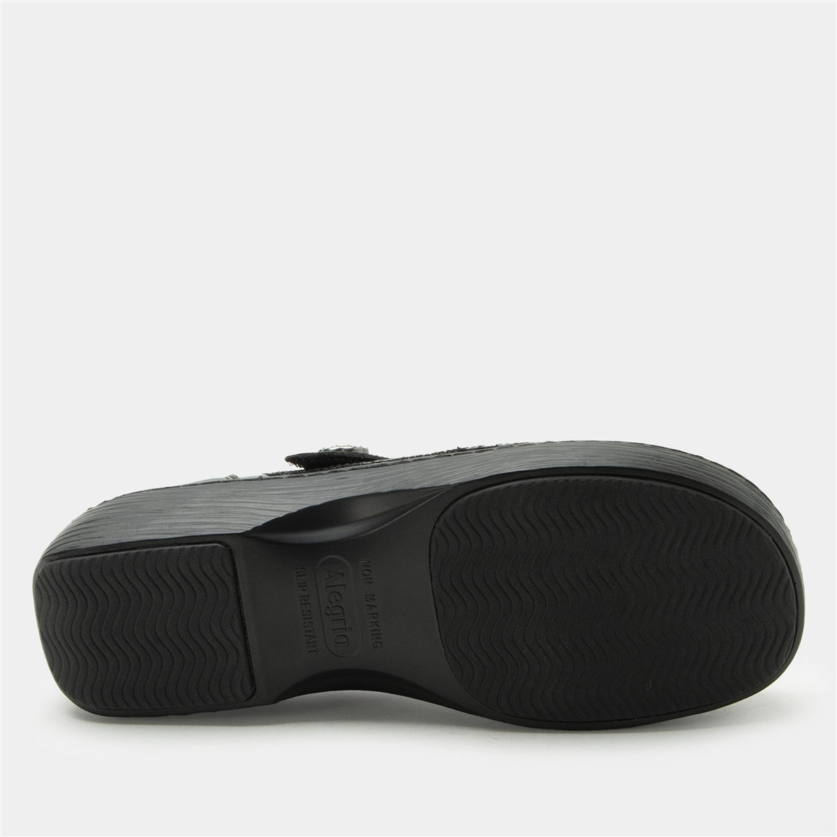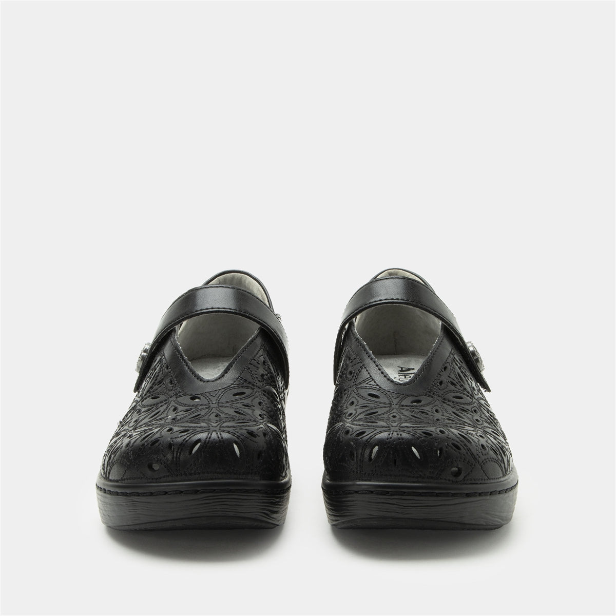Step into style with the Alegria Ophelia in Black Breeze, a contemporary Mary Jane that combines comfort with a touch of flair. This shoe features a laser-etched leather upper in a versatile black shade, adorned with a breezy design for added elegance. The adjustable hook-and-loop strap ensures a secure and personalized fit, while the padded collar and removable microsuede footbed provide all-day comfort. Built with Alegria's patented footbed, it delivers superior arch support for long-lasting wear. Finished with a sleek wood-look bottom, the Ophelia in Black Breeze is the perfect blend of fashion and function for any occasion.Additional Benefits: