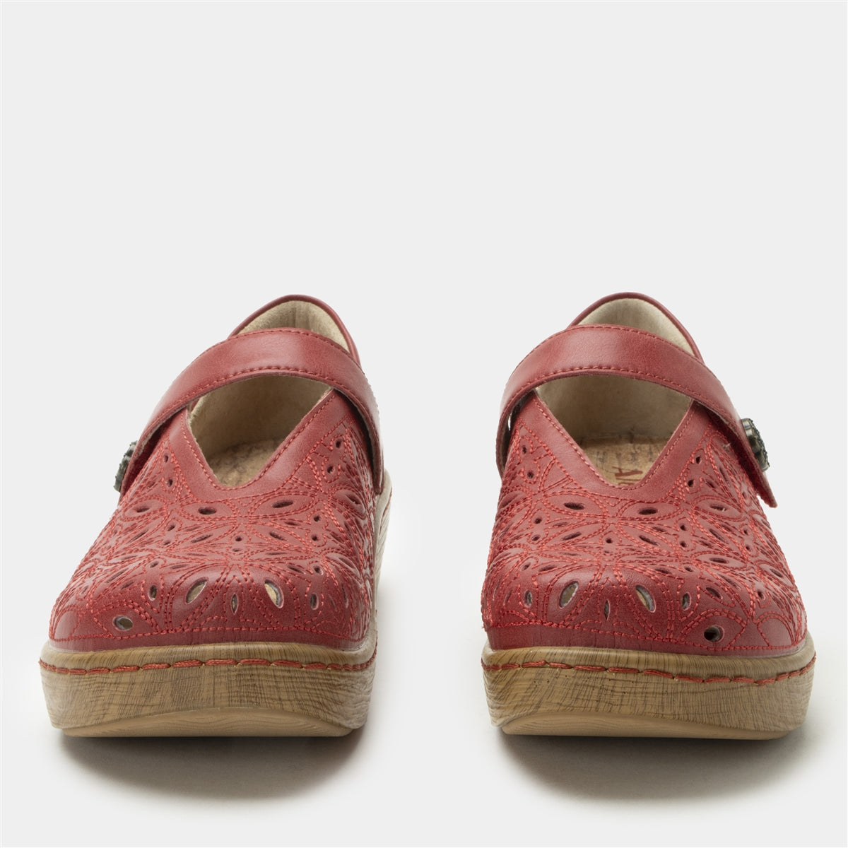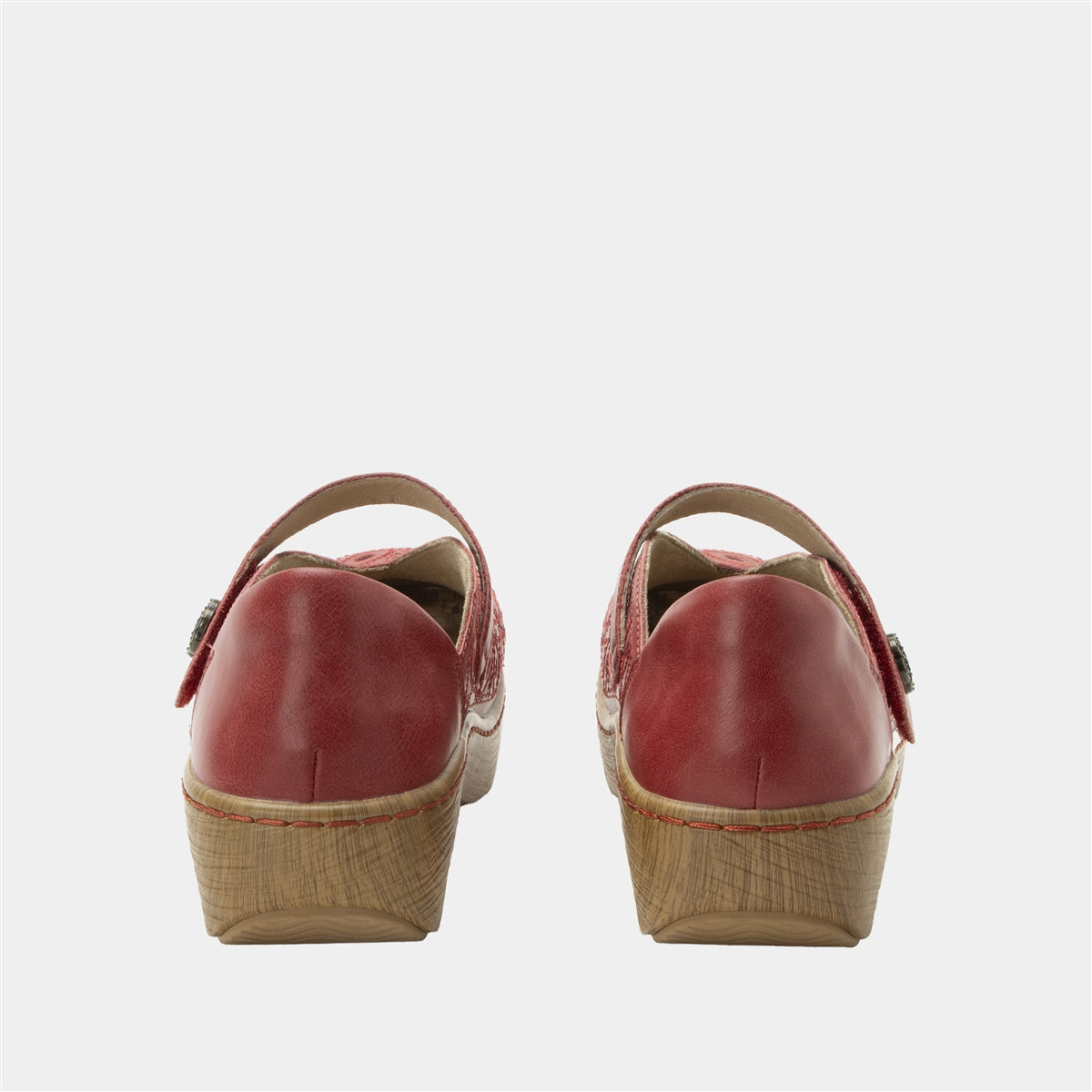 Introducing the Alegria Ophelia in Razberry Breeze, a vibrant twist on the classic Mary Jane that merges style and practicality. This shoe features a laser-etched leather upper in a rich razberry hue with a breezy design, making it a standout addition to any wardrobe. The adjustable hook and loop strap allows for a secure, custom fit, while the padded collar and removable microsuede footbed ensure exceptional comfort. Designed with the patented Alegria footbed, it provides excellent arch support for all-day wear. Finished with a modern wood-look bottom, the Ophelia in Razberry Breeze is the perfect choice for those who want bold style without compromising on comfort.Additional Benefits: