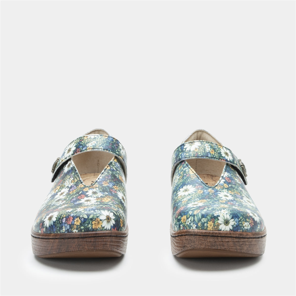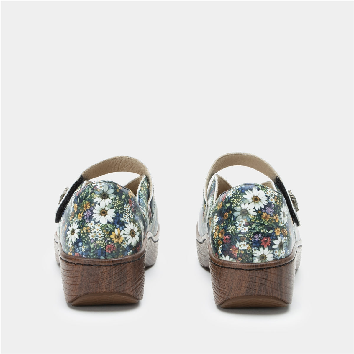 Introducing the Alegria Ophelia in the vibrant Sugar n Spice color, a delightful modern Mary Jane that combines style and comfort effortlessly. This version boasts a lively printed leather upper with a dark green background, adorned with a burst of colorful flowers in shades of white, red, yellow, pink, and blue. It features a convenient hook-and-loop strap for easy adjustment and a snug fit. Inside, the shoe offers a padded collar and a removable microsuede footbed, designed to conform to your feet's unique contours, providing exceptional comfort. The patented Alegria footbed ensures superb arch support, while the chic wood-look bottom adds a fashionable edge. Perfect for adding a splash of color to your day, the Ophelia offers a stylish and comfortable experience.Additional Benefits: