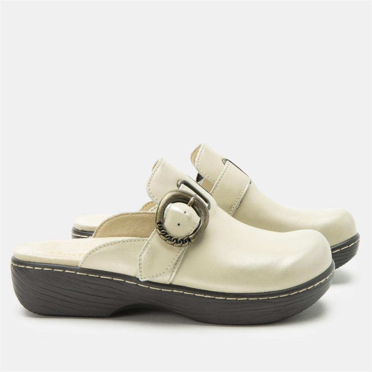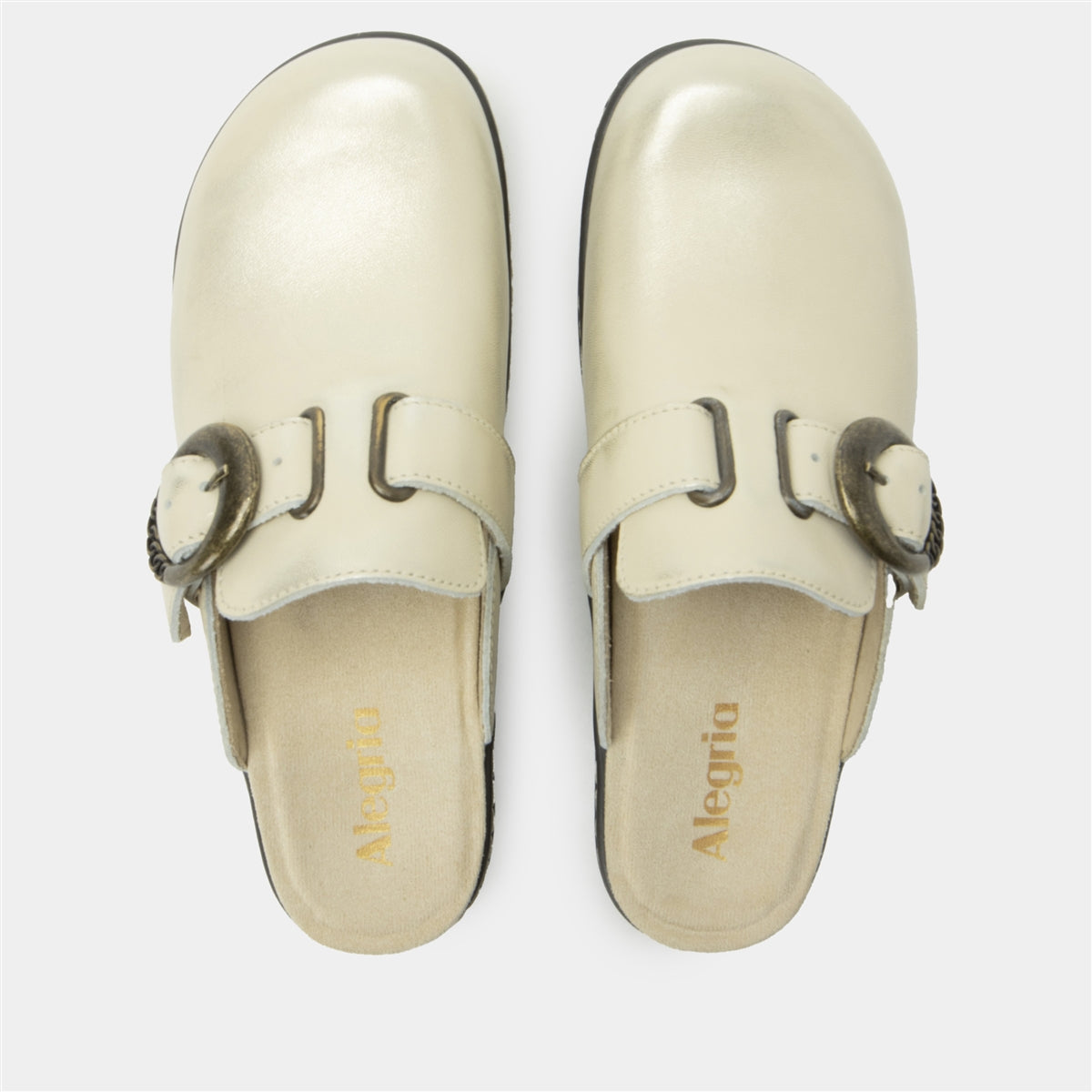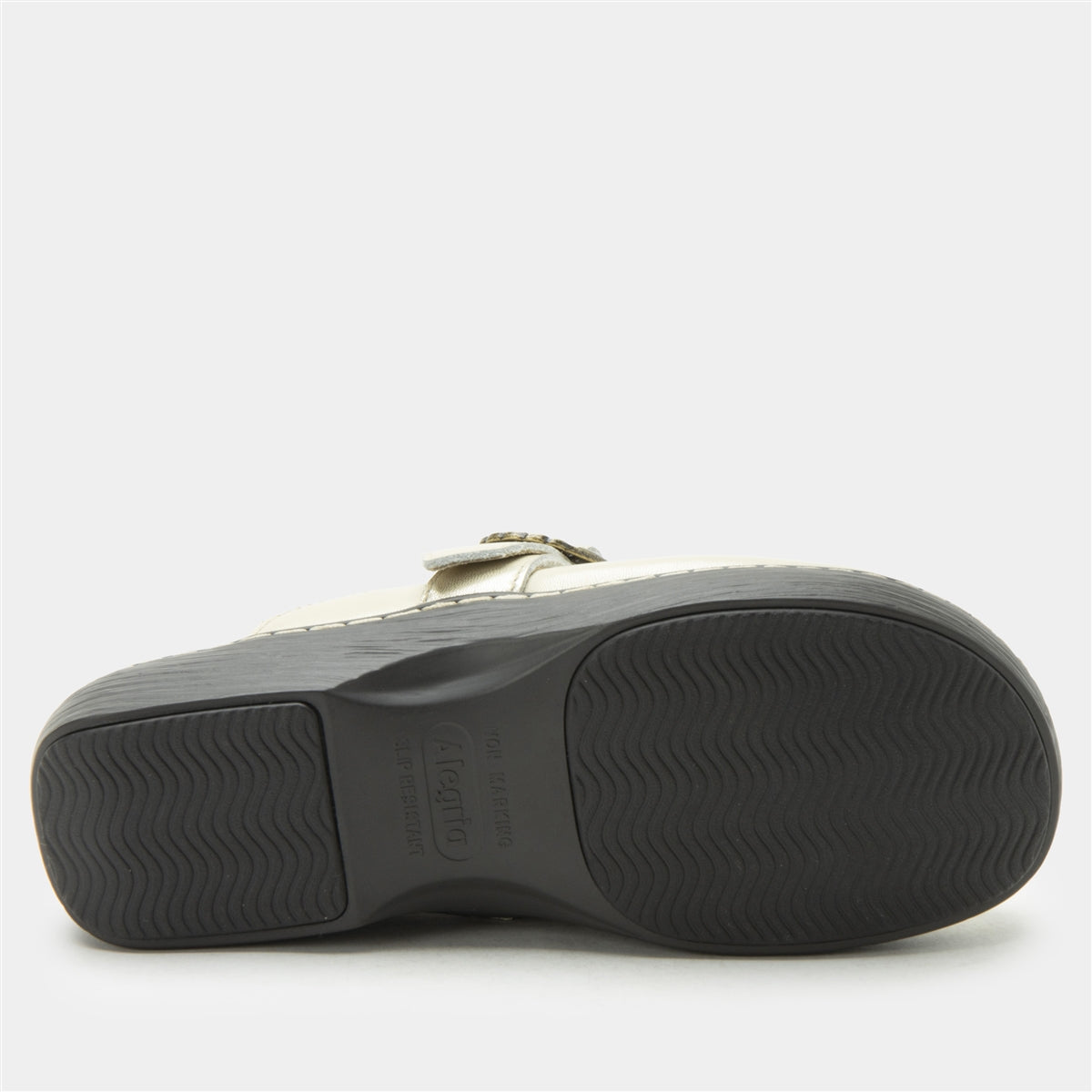 The Alegria Osmosis in Gold Cream brings a fresh, luminous twist to the classic clog. This soft metallic leather upper is paired with an antique gold buckle, creating a standout look that is both refined and bold. With a cushioned footbed and supportive wedge base, it is made for comfort from morning to night.Additional Benefits: