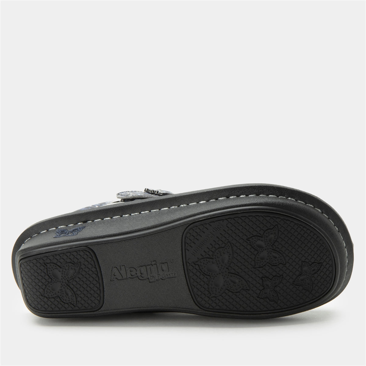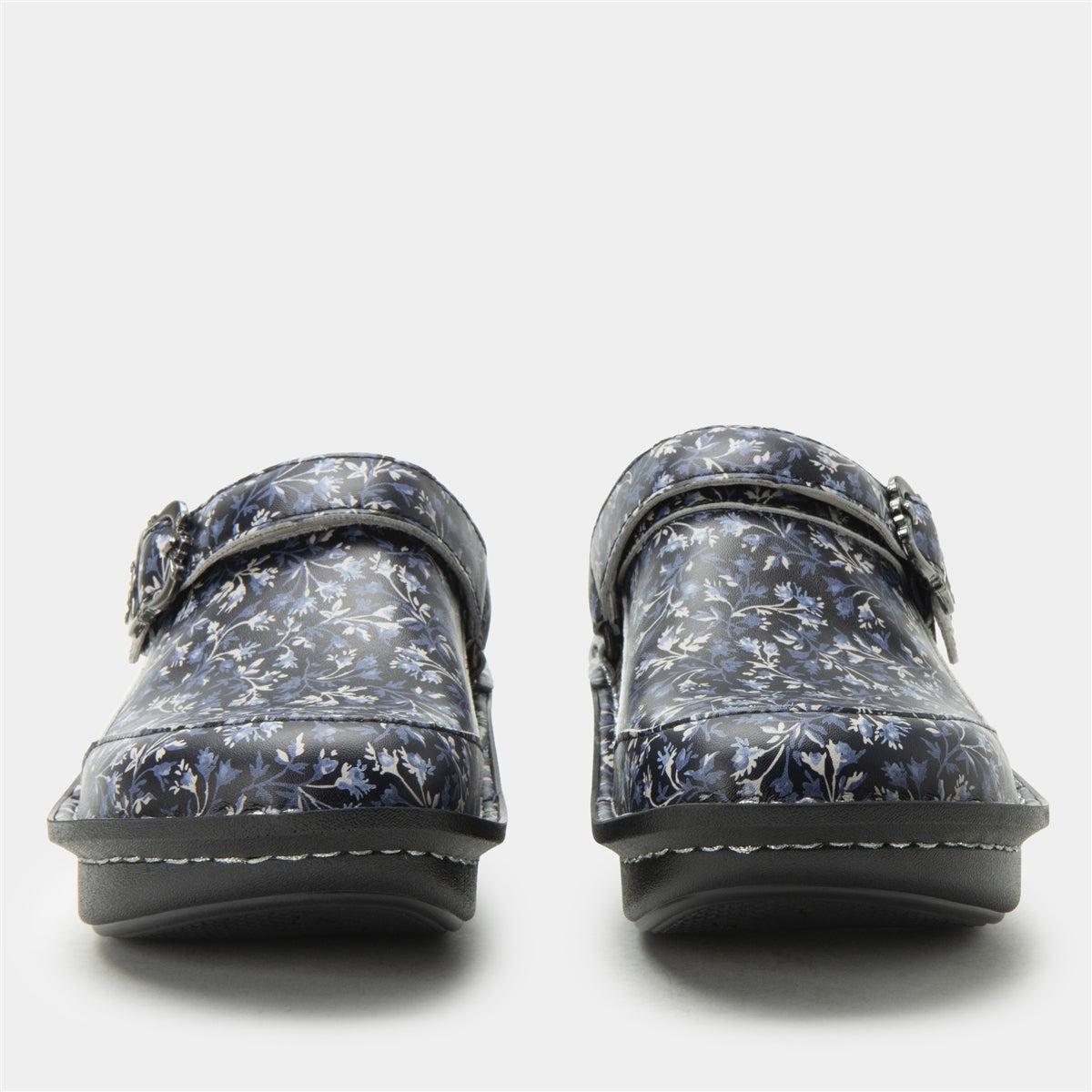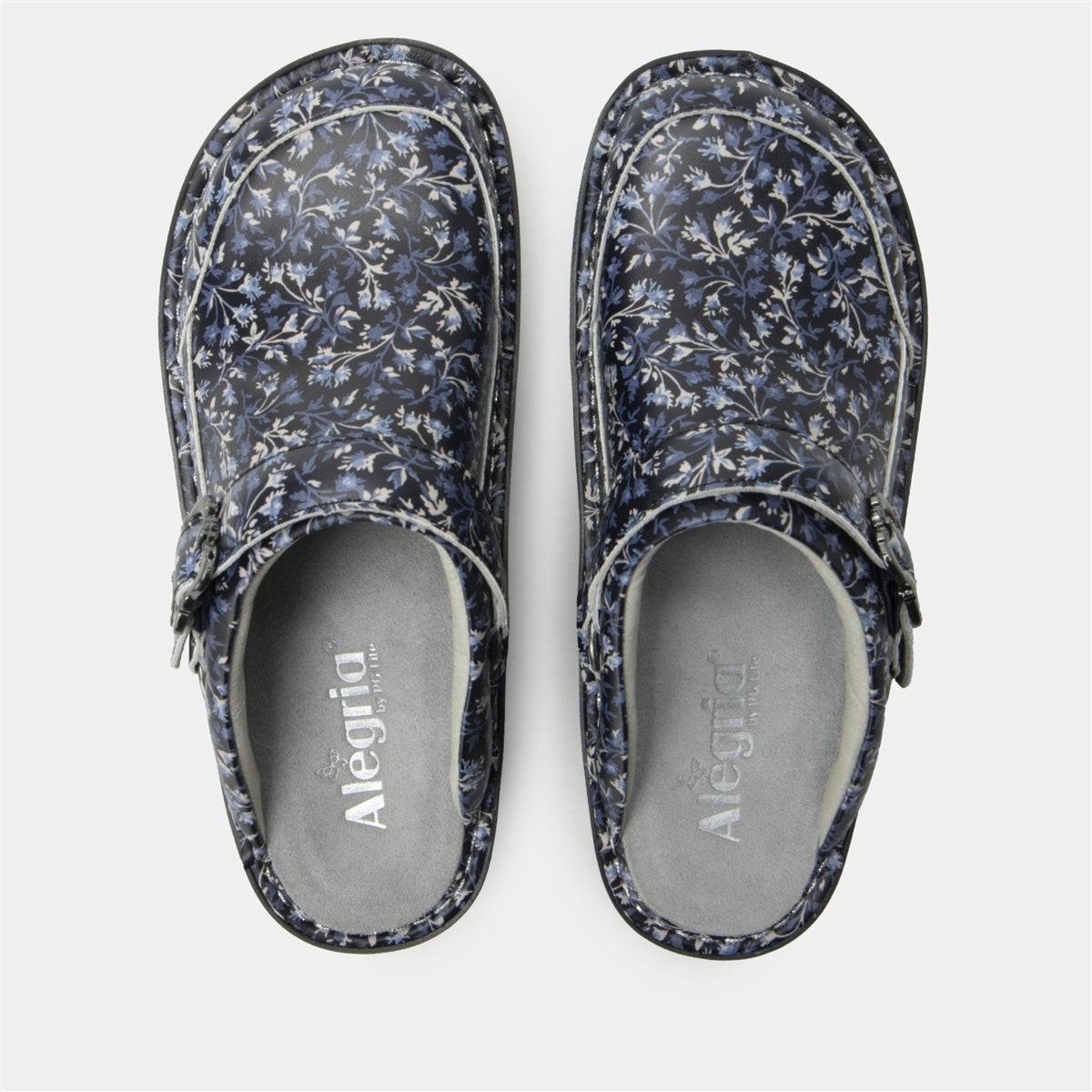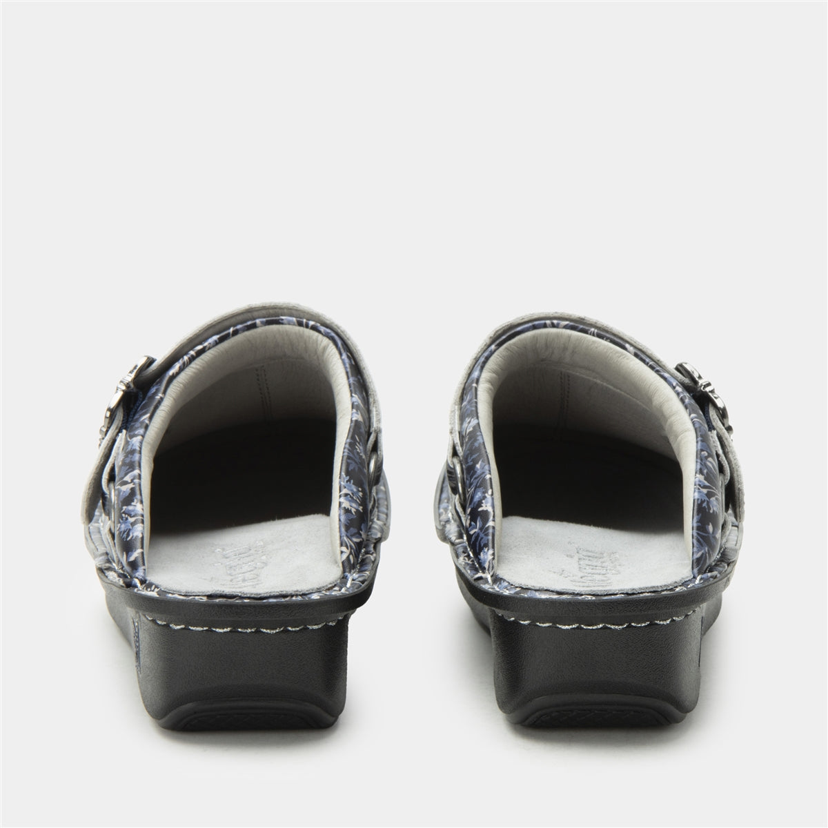 Bring a touch of botanical charm to your step with the Alegria Seville in Indigo Ivy. This easy-to-wear clog features a delicate floral pattern in soft indigo and ivory tones, set against a deep navy background for a refined and feminine look. The adjustable swivel strap can be worn as a backstrap for added security or flipped forward for effortless slip-on styling. Built on a slip-resistant rocker outsole and outfitted with the Alegria signature removable footbed, the Seville in Indigo Ivy provides all day comfort, support, and style for professionals and everyday wearers alike.Additional Benefits: