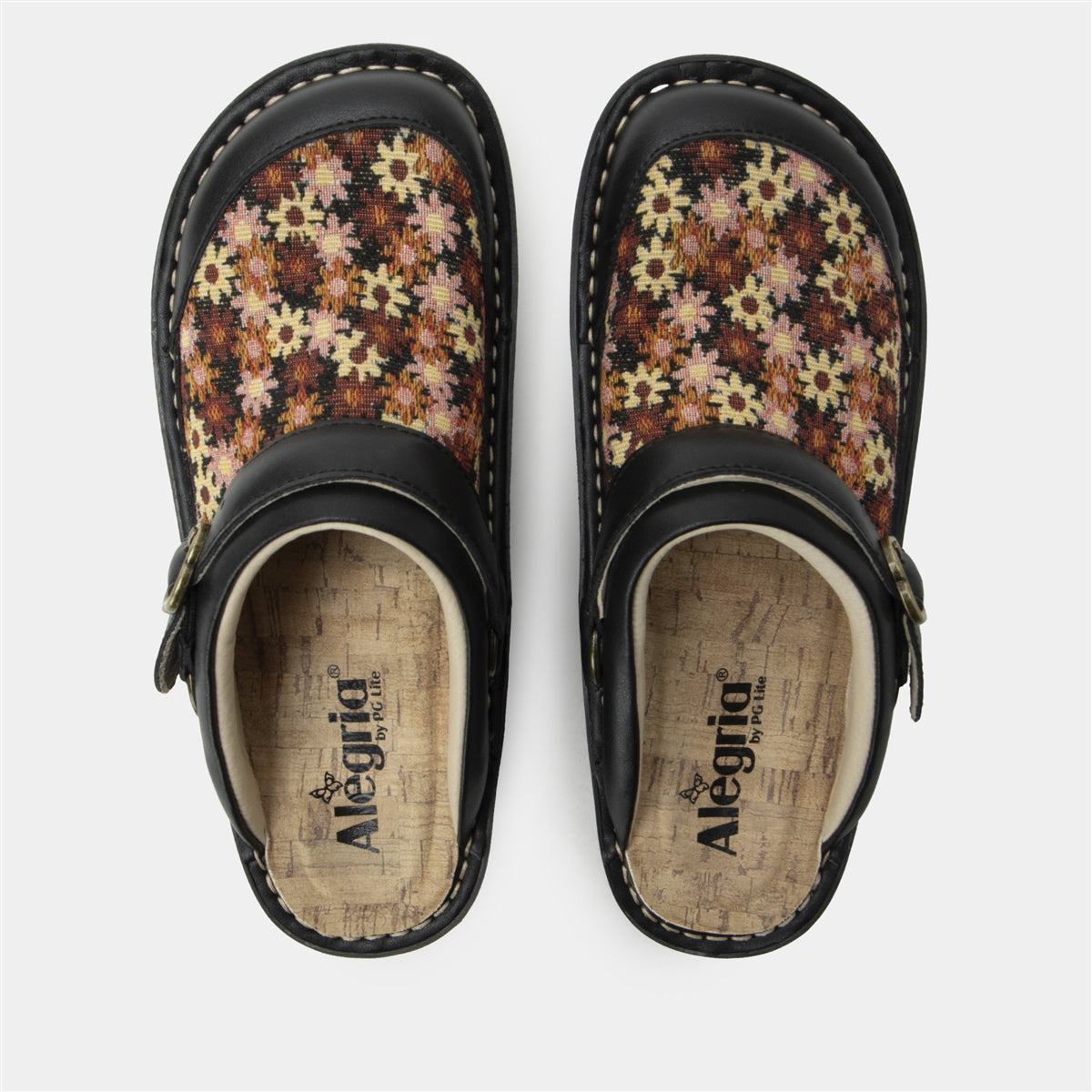 Add a playful twist to your comfort routine with the Alegria Seville in Loosen Up. This vibrant clog features a textured fabric upper in a warm multicolor floral weave, complemented by black leather trim and a signature swivel strap with decorative hardware. Wear the strap as a backstrap for added stability or flip it forward for easy slip-on wear. Designed with Alegria’s rocker bottom outsole and patented footbed system, the Seville in Loosen Up offers supportive comfort and cheerful style, making it an ideal pick for those on their feet or simply on the go.Additional Benefits: