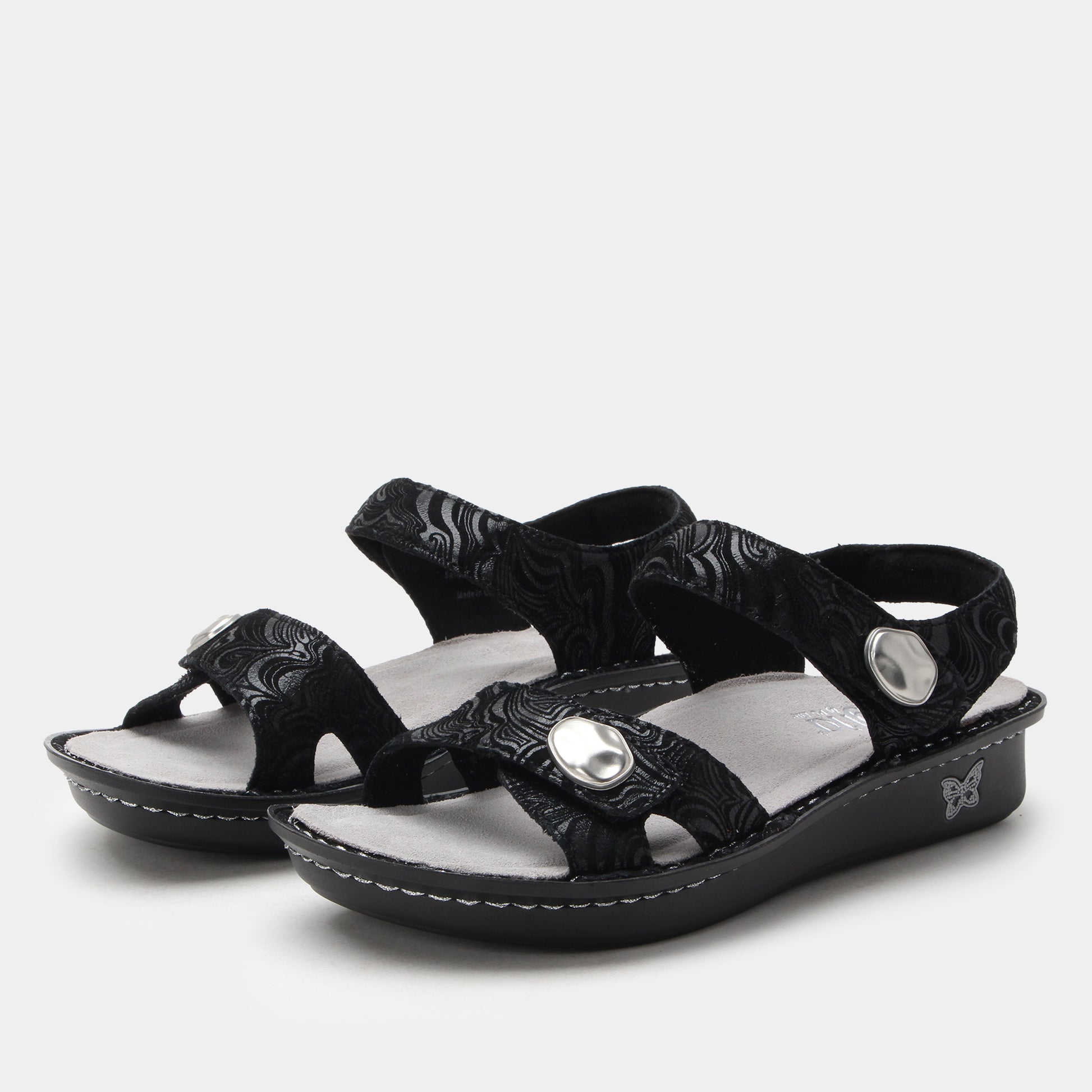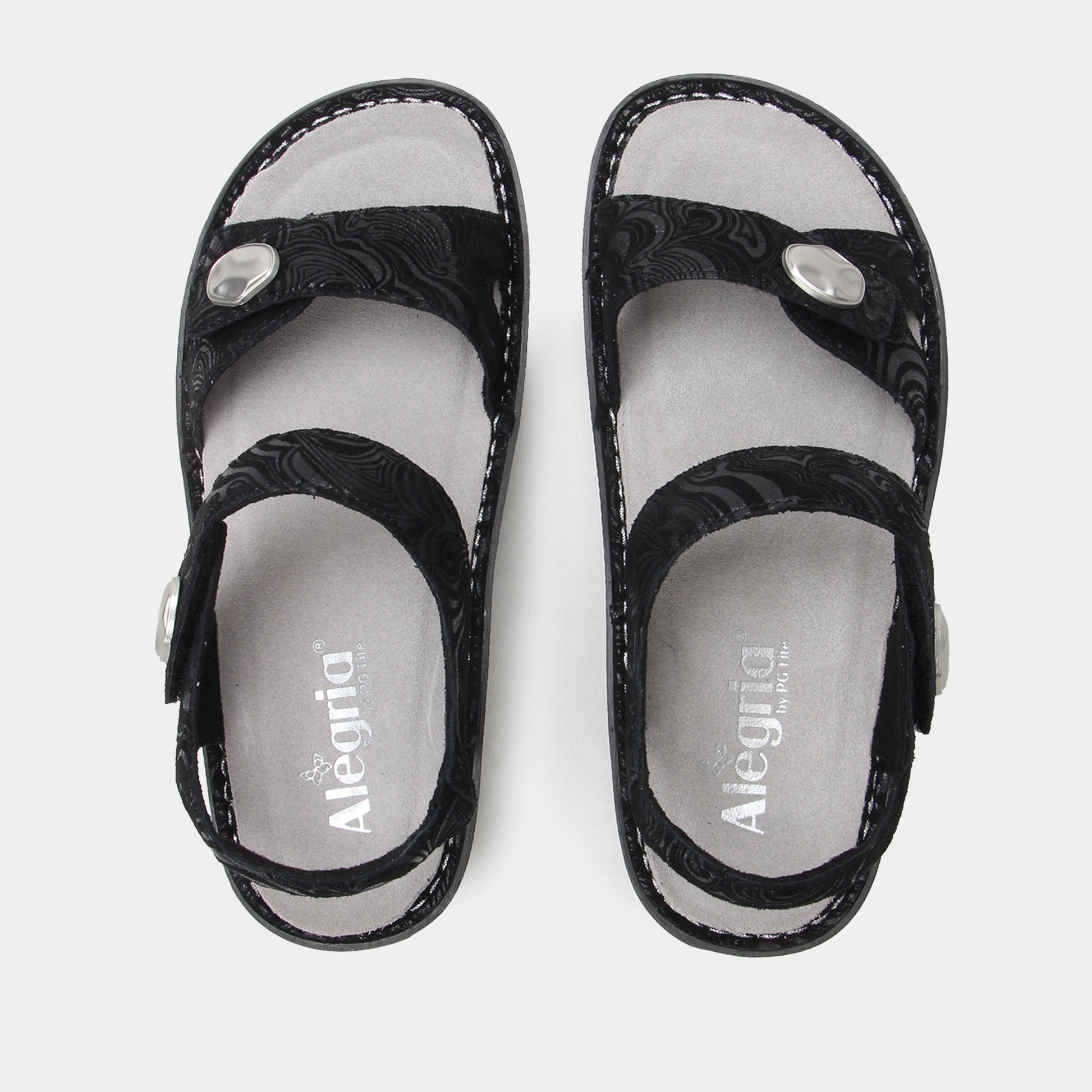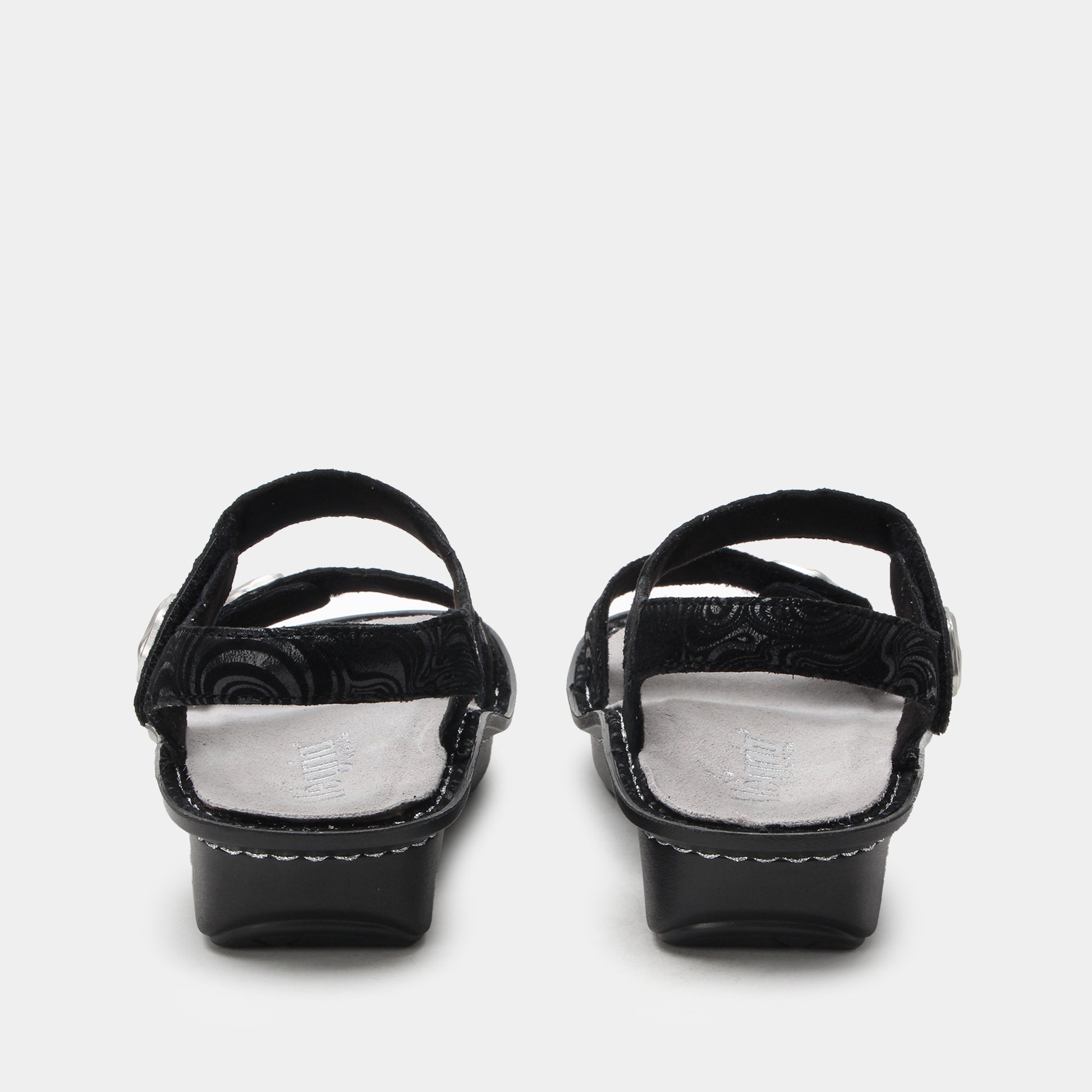 The Alegria Vienna in Swirling Black brings understated sophistication to everyday comfort. The embossed swirl texture creates a soft, dimensional look that complements the polished silver-tone accents. Two adjustable hook-and-loop straps make for an easy, customizable fit, while the slingback design and mini-rocker outsole keep you balanced and supported. With Alegria’s removable Signature footbed, Swirling Black delivers the perfect blend of style, cushioning, and stability for all-day wear.Additional Benefits: