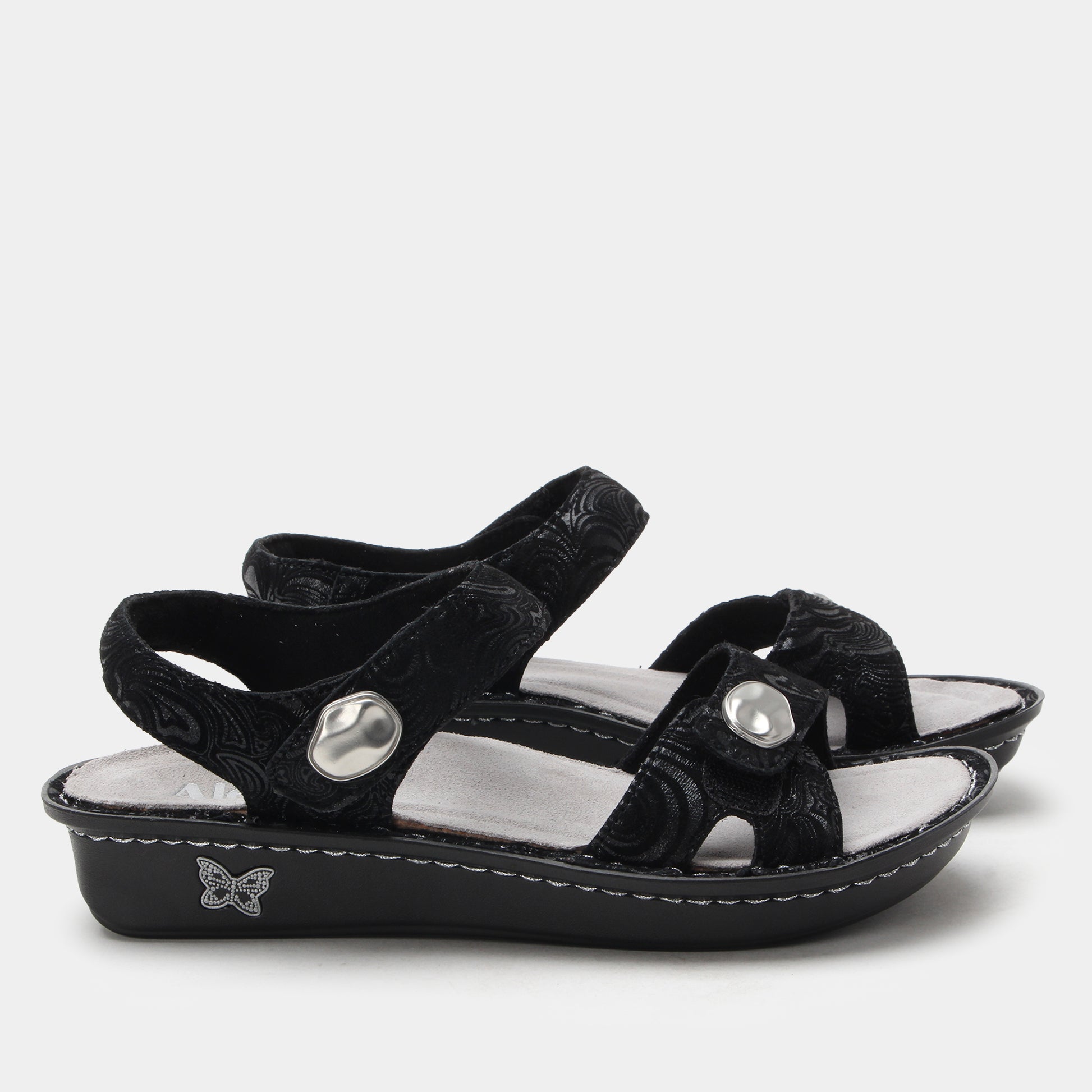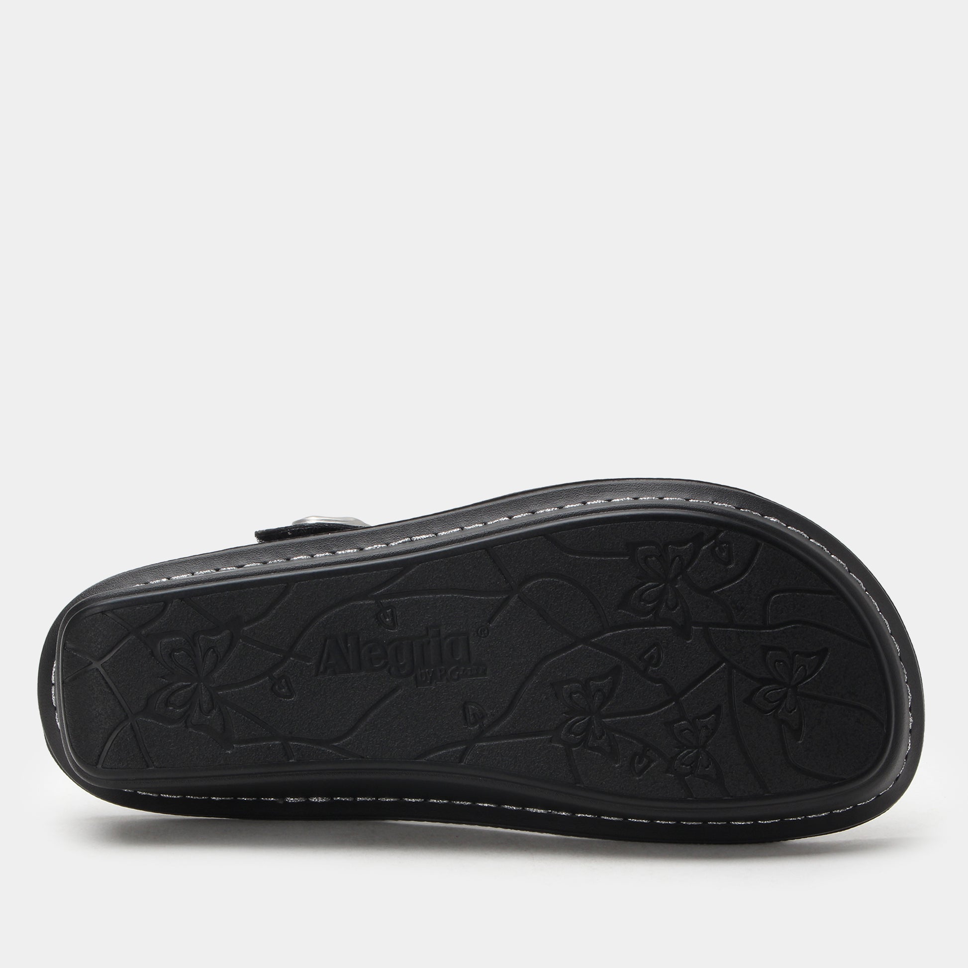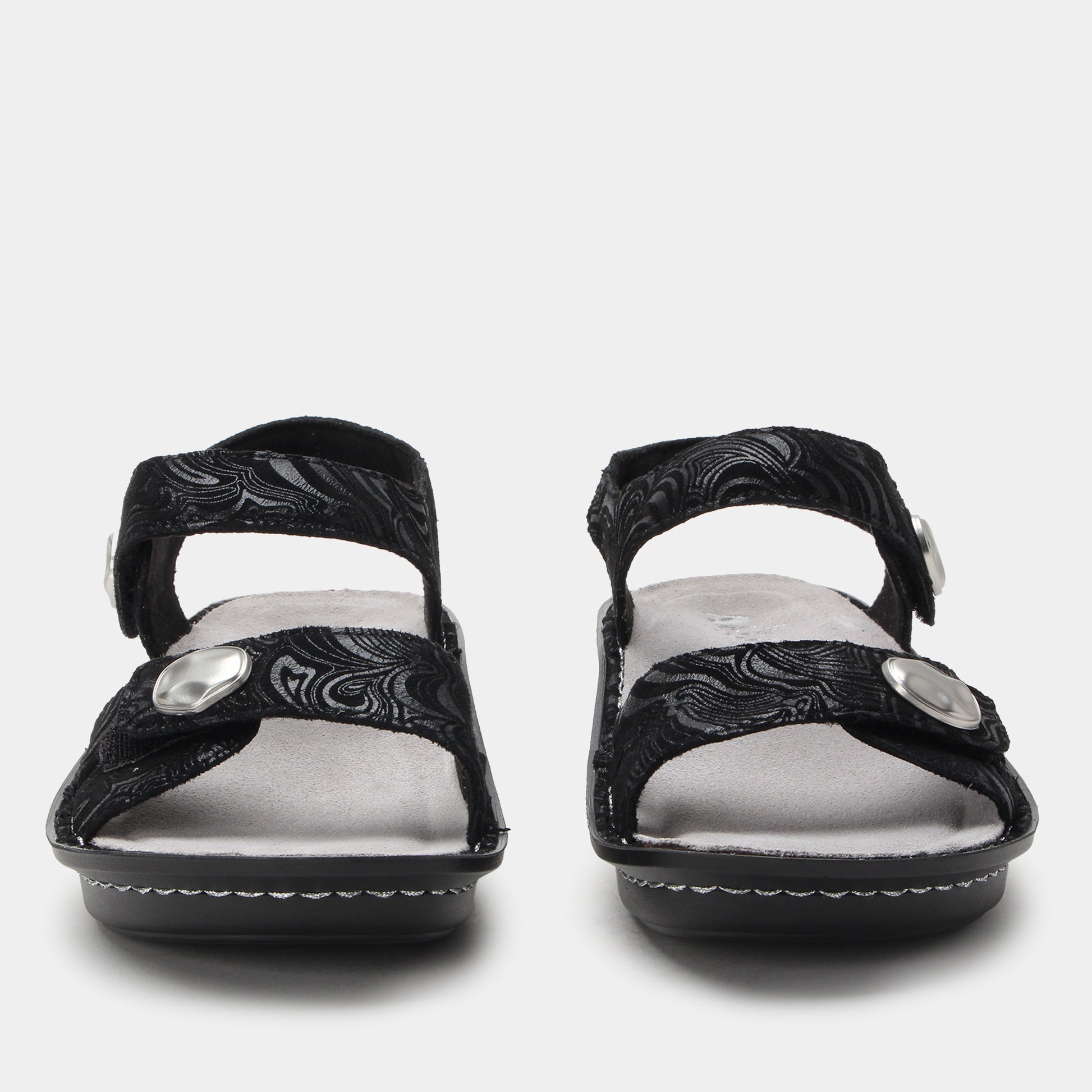 The Alegria Vienna in Swirling Black brings understated sophistication to everyday comfort. The embossed swirl texture creates a soft, dimensional look that complements the polished silver-tone accents. Two adjustable hook-and-loop straps make for an easy, customizable fit, while the slingback design and mini-rocker outsole keep you balanced and supported. With Alegria’s removable Signature footbed, Swirling Black delivers the perfect blend of style, cushioning, and stability for all-day wear.Additional Benefits: